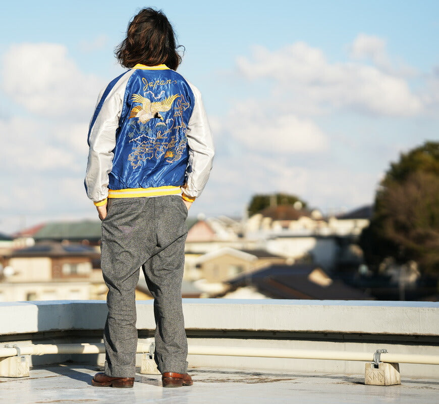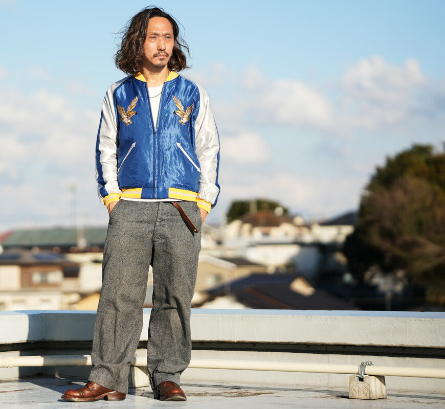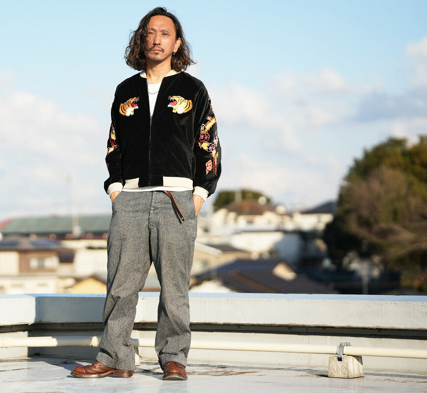 ![]() モデル:身長175cm 体重62kg Lを着用 2026年の正月に発売するテーラー東洋のリミテッドエディション。 本作の魅力は、他のヴィンテージとは一線を画す鮮やかな「黄金色」の色糸。 そして最大の特徴は、所狭しと袖をうねる龍の刺繍である。 通常、スカジャンの主役は背中の刺繍だが、この一着は袖の龍が主役と言っても過言ではない。 肩から袖口まで、腕全体に巻きつくように龍が身体をうねらせており、刺繍のサイズも大きく非常にダイナミックでレアな仕様となっている。 ベースとなったのは1950年代中期のヴィンテージ。川が流れる岩場で咆哮する背中の「笹虎」は日本の伝統的なモチーフだが、 笹をブルー、岩場をレッドの色糸で刺繍しており、色の三原色がブラックの別珍に映える華やかな仕上がり。 また本作ではJapanの文字もレッドとなっており、レアな配色の刺繍をホワイト単色のリブで引き締めている。 リバーシブル面は日本地図をメインにした通称ジャパンマップ柄。青空や大海を想わせるブルーのサテン生地に、 イエローを基調とした刺繍とリブのコントラストが映える。通常、マップと共に描かれる鷲はデフォルメされることが多いが、 作では緻密な針足で翼のグラデーションまで写実的に描かれている。 数あるジャパンマップ柄のなかでも特に秀逸で豪華な刺繍と言えるだろう。 ボディの仕様に関しても特殊で、通常の別珍スカジャンと異なり中綿は無し。別珍×サテンのリバーシブルだが キルティングステッチが入らないレアなディテールを再現している。本作の特別な仕様や豪華な刺繍は 新年の幕開けを祝う初売りに相応しく、このタイミングで初の復刻に至った。 重量:980g ![]() スカジャン誕生当時から米軍キャンプに納品していた老舗ブランド。 スカジャンのトップブランドとして常に業界をリードしています。 また、シュガーケーンやバズリクソンズなど完璧な出来栄えのアイテムを毎年沢山発表しています。 ![]()