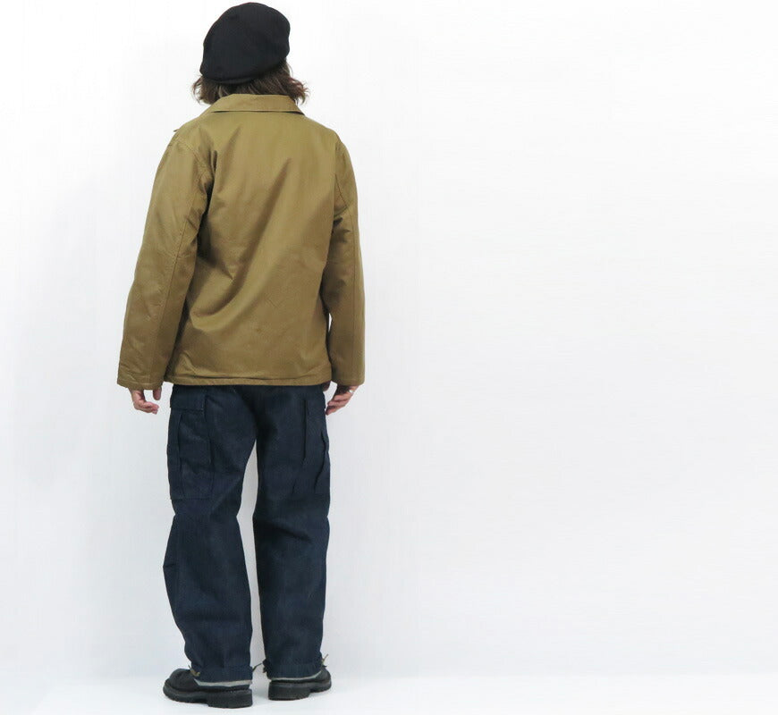 サイズの計測方法についてはこちらをご覧ください。 素材 表地:コットン100% 裏地:ウール60% コットン28% レーヨン12% カラー カーキ ブラウン 生産国 日本 備考 サイズは実寸を計測し平均値を記載しております。若干の個体差はございますので、ご了承ください。 商品に関して 当店の取り扱い商品はヴィンテージアイテムをベースとしたデザインの商品が多数ございます。雰囲気を重視するために若干の縫製のずれ、生地の色合いや加工による風合い、色ムラなど、仕上がりが異なる場合もございますが、それらも商品の魅力としてご理解下さい。また商品の仕様(縫製・パーツ・色合い・サイズ等)は予告なく変更される場合がございます。以上の点をご理解いただいた上でお楽しみいただければ幸いです。 |