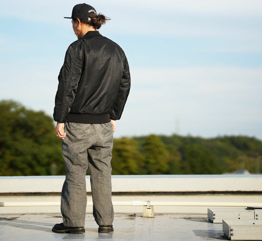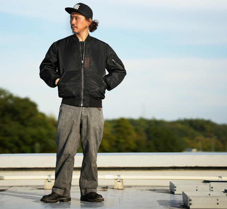 ![]() モデル 身長175センチ 体重62キログラム サイズLを着用 ![]() モデル 身長175センチ 体重62キログラム サイズLを着用 ![]() ウインドフラップ 初期型の特徴である角型フラップ。身頃でも使用されるウールパイルが内蔵されたウインドフラップが ファスナーレールの隙間から侵入する冷気を防いでくれる。ジグザグのトップステッチはパイルを固定 すると同時に膨らみを抑え運動性を考慮したもの。 ファスナー レザーのプルタブが着いた大型のファスナーはパイロットグローブを着用したままでも開閉が可能。 スライダーは常時ファスナーレールをかみ込むインターロック機構を持ち、引手をもって上下に スライドさせた時にロックが解除され、不用意にファスナーが動かない画期的な機構。 ポケット袋地 経糸にレーヨン、緯糸にウールを織り込んだ生地は一枚の布地で両側を使用することが可能。 ウール側は起毛して厚みを持たせMA-1のポケット地に、レーヨン側はL-2Bのライニングに使用して 滑りを翌して運動性を確保した。 サイズ詳細