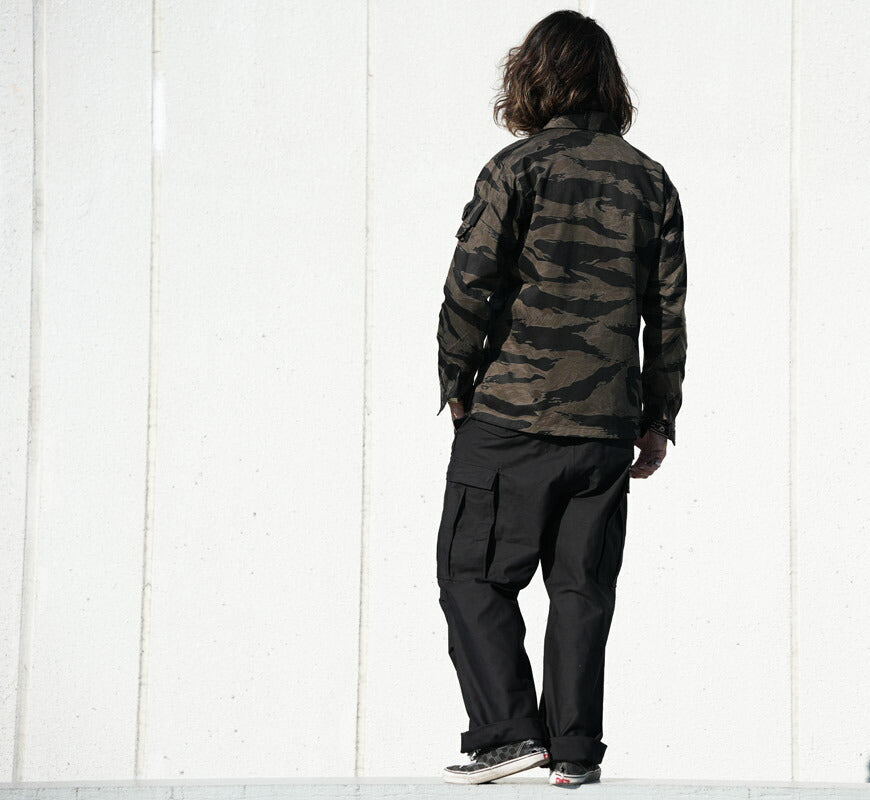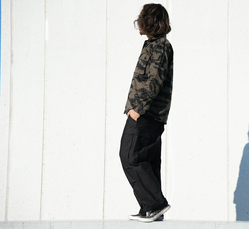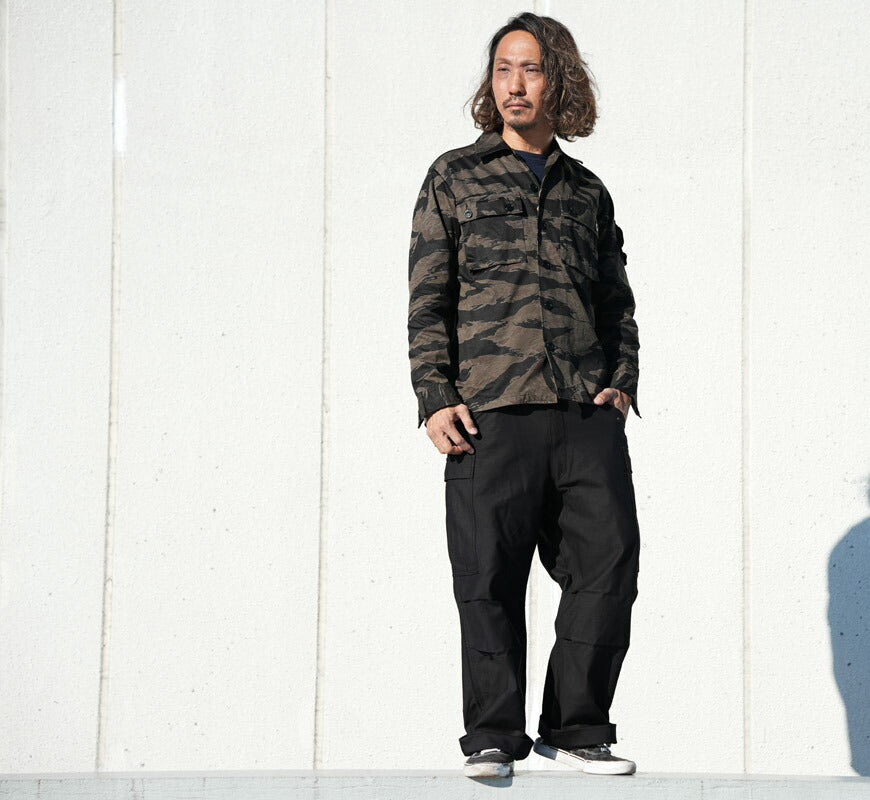 ![]() モデル:身長175cm 体重62kg Mを着用 米陸軍が1951年に採用したコットンサテン地を裏使いしたフィールドトラウザース。陸軍はこの頃、 寒冷地用の戦闘服としてM-51シリーズのセットアップレイヤードシステムを採用した。 アンダーシャツ、ドラウァー(ズボン下)を履いた上にウール製のフィールドシャツとフィールドトラウザースを着用し 更にその上からコットン製のフィールドジャケットとフィールドパンツを着用した。いずれのM-51も寒冷地での着用を考慮し、 ルーズフィットにすることで体温を閉じ込め、外気を遮断する効果を重視している。ウエスト内側に設けられたコードループは、 サスペンダーの先端に付いた金属製のフックを引っ掛けるためのディテールである。 <WILLIAM GIBSON COLLECTION> バズリクソンズがブランドデビュー10周年の時に初めてプロデュースしたBLACK MA-1。世界的に著名な小説家ウィリアム・ギブソン氏の『パターン・レコグニション』には、登場する主人公が着用する『Buzz Rickson's Black MA-1』の文字が刻まれている。その小説から飛び出し、実際のBuzz Rickson's Black MA-1が誕生した。米空軍において1950年代に正式採用となったMA-1の規定色は本来ならセージ・グリーンであるが、色がブラックでミルスペックに基づいた軍規格のパーツ、資材を使用した本格志向のBLACK MA-1は世の中に存在していない。そのため市場において本物志向のユーザーからは好評で話題となった。資材をそれぞれブラックの色で指示してもそれぞれ素材によって染まり方が異なり、それらを一着のジャケットに構成すると微妙に色の差が表れ、フライトジャケットがどれだけの異素材で構成されているのかが明確になる。 重量:980g ![]() バズリクソンズはシュガーケーン・サンサーフなどヴィンテージ系アメリカンカジュアルブランドを擁する東洋エンタープライズ社のミリタリーブランドです。同社とミリタリーとの関係は古く、同社の前身企業である港商事時代に米軍ベースにスーベニアジャケット(スカジャンなど)などの商品を納入していたというルーツを持ち、1993年にはフライトジャケットのファーストを発売。以後次々と復元されるミリタリーウエアはサンサーフのハワイアンシャツ、シュガーケーンのデニムウエアーと同様、どれも完璧な出来ばえです。