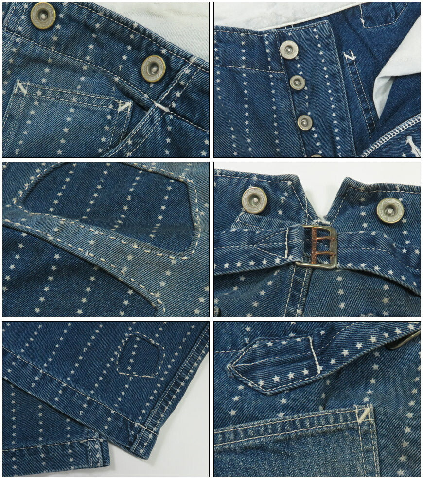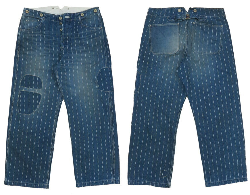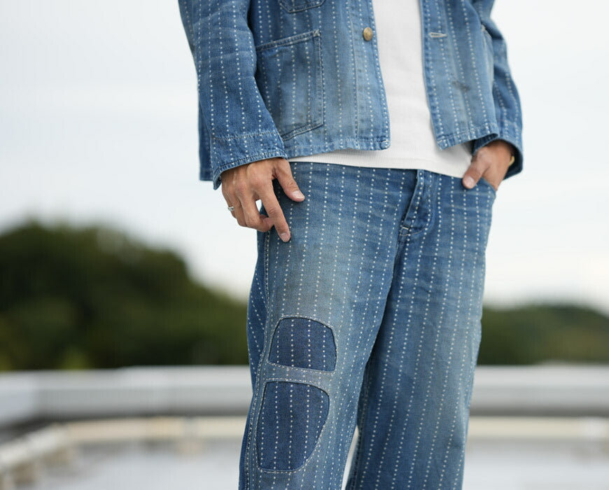 ![]() モデル 身長175cm 体重62kg 32インチを着用 1138のH.Wバージョン。ハンドステッチ風のリペアパッチワークをランダムに施したデザイン。 インディゴ染めのツイル素材に、スクリーンプリントで星柄のウォッシュストライプを施した素材を用いた 1900年代初頭に見られたワークパンツ。ワイドシルエットで、V字に割れたバックスタイル、シンチバック、 サスペンダーボタンなどクラシックディテールを徹底。左バックポケットのデニムは19世紀に作られていた アモスケグ社の11ozデニムを当時の資料を基にリプロダクトしたもの。 重量:770g ![]() 単なるレプリカジーンズという枠にとどまらず徹底的にシルエットにこだわっているブランド。 パンツ・トップスどれをとってもバツグンにきれいなラインは 多くのファンをひきつけています。