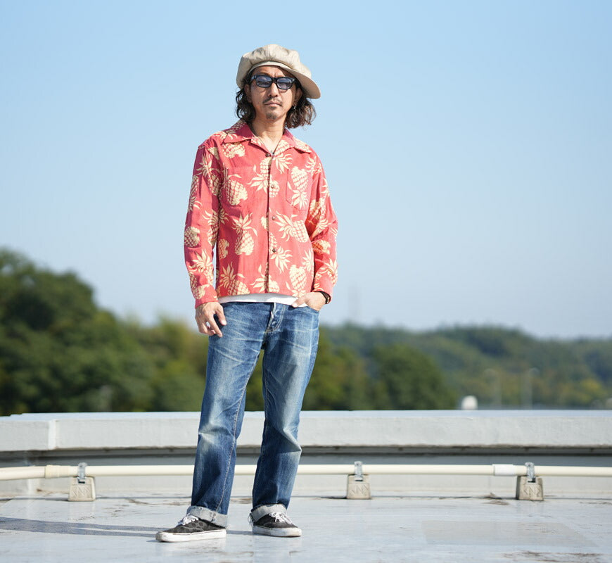 ![]() モデル:身長175cm 体重62kg Mを着用 ハワイアンシャツの名作デザインをコーデュロイ素材のオープンカラーシャツに落とし込んでいます。 1950年代に作られたデューク・カハナモクのヴィンテージアロハシャツのなかでも 代表的なデザインである「デュークス・パイナップル」。 着用と洗濯を繰り返すことでボディーが退色しプリントもかすれてくるので より風合いが増して素朴な雰囲気になっていきます。 重量:620g ![]() サンサーフは、東洋エンタープライズのアロハシャツ専門ブランドです。サンサーフのアロハシャツは、すべてヴィンテージとしてかつて実在したデザインのものを当時の風合いそっくりにレプリカしています。他では真似できない膨大な量の社内コレクション、ノウハウがあって初めて可能となる製品造り。コレクターの方から、アロハを初めて着る方まで、幅広くオススメできるブランドです。 ![]() ![]() 119:ブラック ![]() 162:ピンク ![]() 165:レッド ![]() ![]() ![]() サイズ詳細 サイズの計測方法についてはこちらをご覧ください。 素材 コットン100% 生産国 日本 カラー ブラック ピンク レッド 備考 ※サイズは実寸を計測し平均値を記載しております。若干の個体差はございますので、ご了承ください。 商品に関して 当店の取り扱い商品はヴィンテージアイテムをベースとしたデザインの商品が多数ございます。雰囲気を重視するために若干の縫製のずれ、生地の色合いや加工による風合い、色ムラなど、仕上がりが異なる場合もございますが、それらも商品の魅力としてご理解下さい。また商品の仕様(縫製・パーツ・色合い・サイズ等)は予告なく変更される場合がございます。以上の点をご理解いただいた上でお楽しみいただければ幸いです。 |