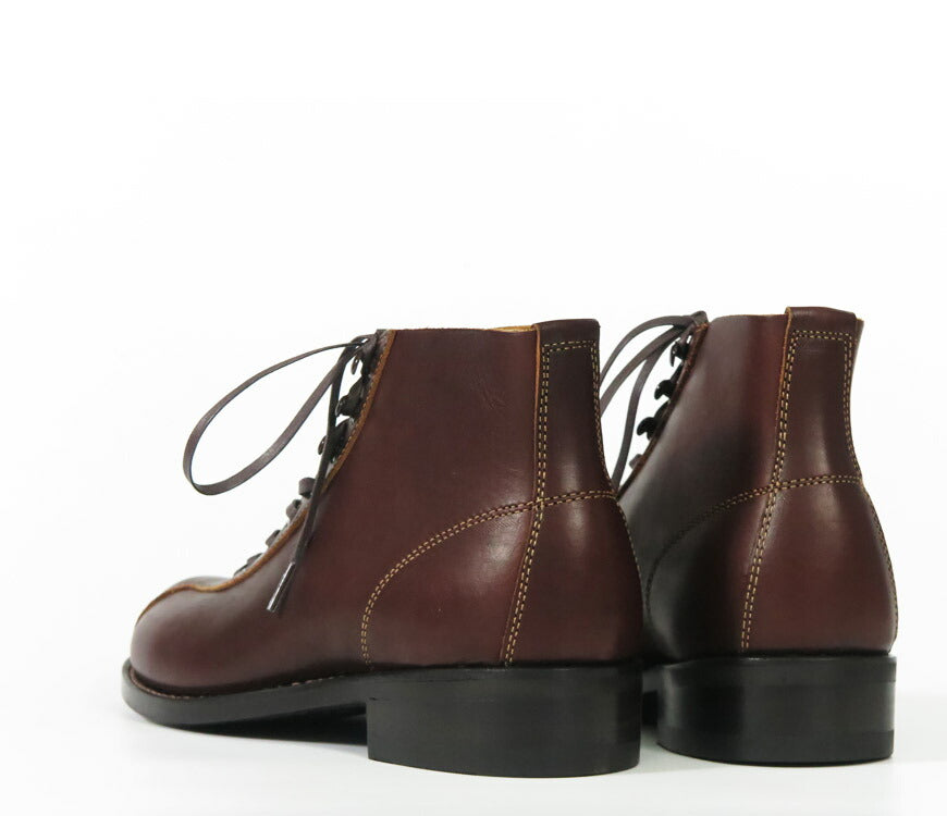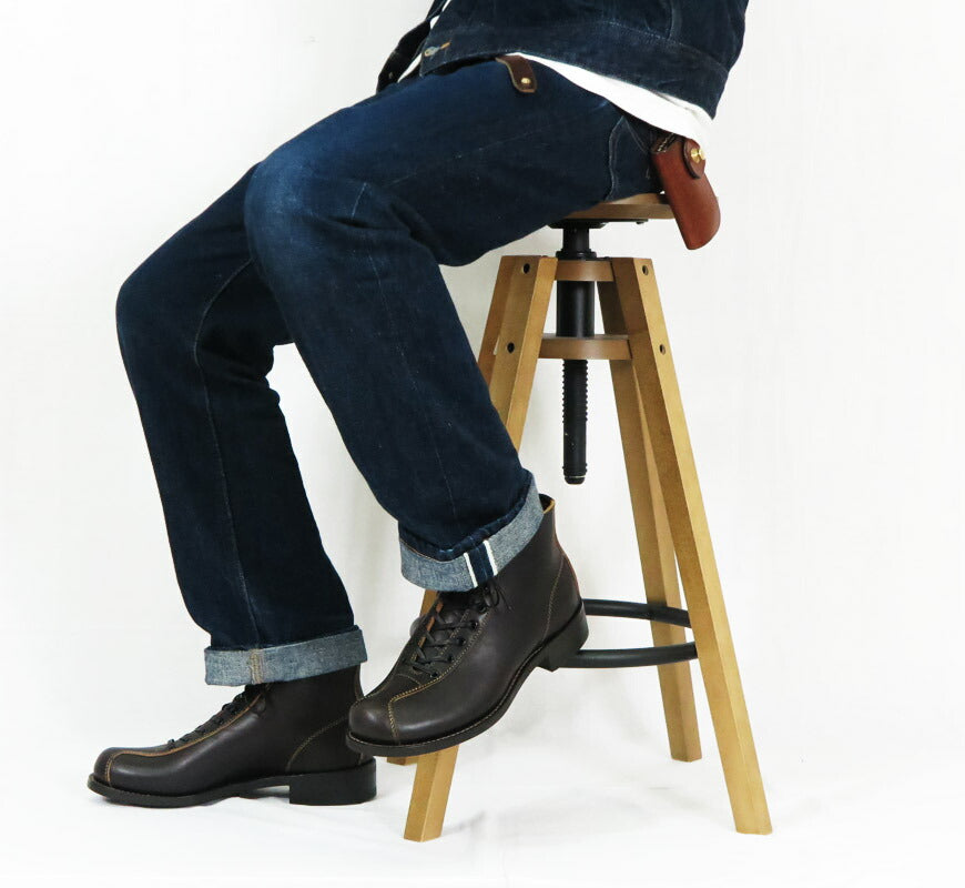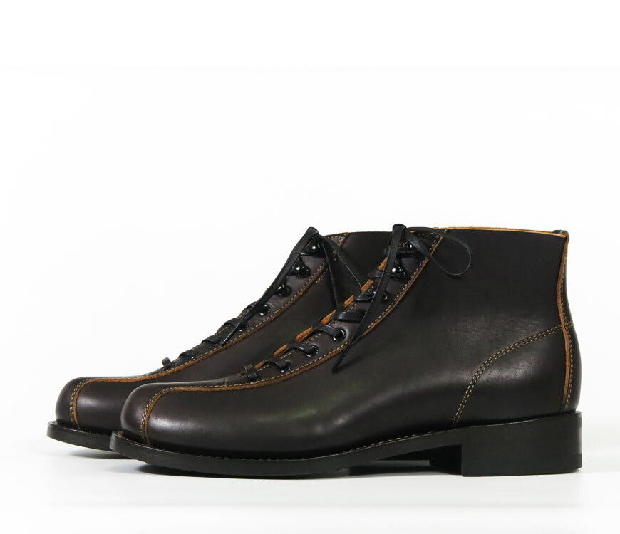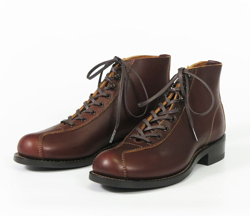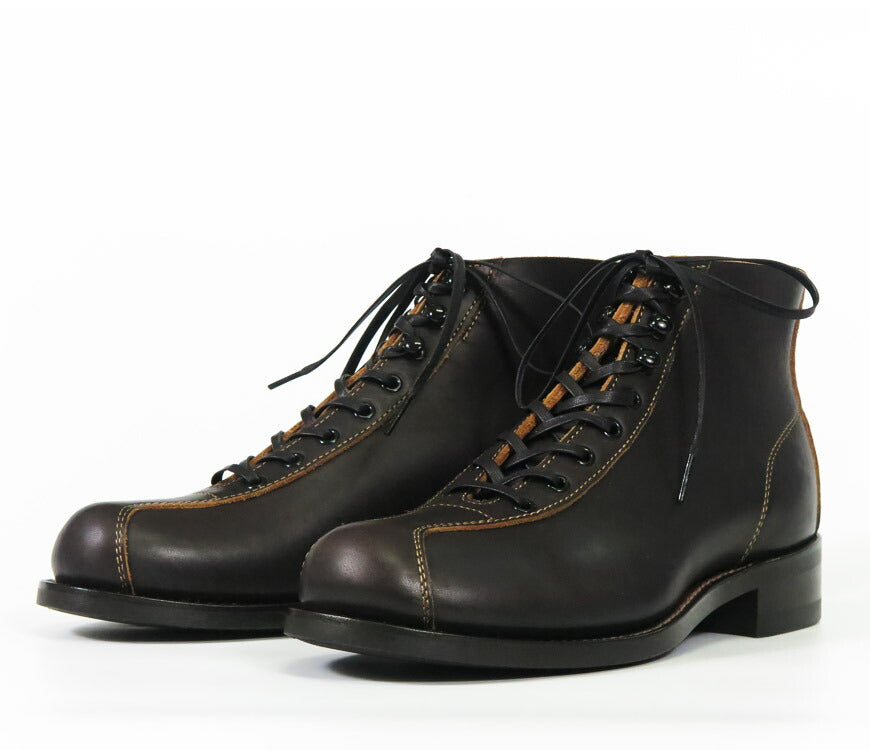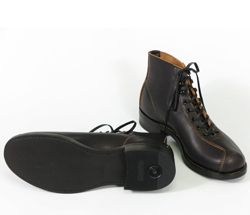 The 2 Monkeys の新たなブーツ RANDONNEE (ランドネ)は、アメリカで 20世紀初めに登場して 「アウティングブーツ」「スカウトブーツ」などと呼ばれたブーツをモチーフとしたものです。 サイドをそれぞれ一枚の革パーツで作ってつま先とカカトで縫い合わせ、センターに紐通しからキャップへ続く 革パーツを取り付けた構造の、このアッパーデザインは、1880年頃から野球やフットボールのスパイクなどに用いられていたものです。 サイドに革の縫い合わせがないことや、つま先近くまで紐を通せることで足にしっかりフィットさせられるからでしょう。 このデザインにレザーまたは薄めのラバーのソールを組合わせて、マンソンラストのような、足の指先の形に近づけた オブリーク型の木型を使って、アウトドアのイメージを持つスポーティーな革靴(ブーツ)が開発されたのが 1910年前後です。 その後約20年間 アメリカの多くの靴メーカーがこのブーツを作っていました。 The 2 Monkeys の RANDONNEE (ランドネ) は、当時のデザインをベースに、マンソンラスト のつま先を修正したオリジナルの木型を使い、約3mm厚の革でつくったブーツです。 極厚の革ですが、ライニングを付けない一枚革で靴にしていることもあり、足馴染みは良好です。 この「たつのハンドワックスレザー」は、オイルを加えたタンニンなめしの革を丘染めし、 その銀面に熱して溶かしたワックスを大きなハンドアイロンで含浸させています。 革一枚にワックスを染み込ませるのに、手作業で 20-30分かける、という非常な手間をかけて作る革です。 しっとりした肌と、フルアニリン(染料のみで染めた)レザーならではの透明感を持ち、履き込むと 深まる色の陰影と、色がフェイドして浮き上がるように出る茶芯で、味わい深い経年変化をします。 しっかりと目が詰まったダブルショルダー(牛の左右の肩の部位)の革を用いているため、 トラ模様が入ることがありますが、革が本来持つ自然な表情として楽しんでいただけると思います。 The 2 Monkeys The 2 Monkeys は、JELADO 代表 後藤洋平氏、元レッドウィングジャパン代表 鈴木理也氏の二人によるブランドです。後藤氏が Jelado で展開してきたビンテージウェアの面白さに、クラシックなワークブーツの世界を掘り下げてきた鈴木氏の感性を加えて、今まで無かった時代感を持つブーツをつくるために立ち上げられました。The 2 Monkeys が特に注目しているのは、ワークウェアやブーツが、アメリカで独自の発展をし始める少し前、ヨーロッパとアメリカが同じルーツの元に影響を与え合いながら分化し始めた時代です。ブーツなどでは20世紀初頭かそれより前の時代、ウェアに於いては19世紀終盤かそれ以前でしょうか。身につけるものの製造が、本格的に大量生産体制に移行する初期の時代。また、それ以前の小さな工房で手作業を中心として、靴や衣類がつくられていた頃です。そうした時代に生まれた、独自の様式や歴史に埋もれたストーリーを持つ、多様性に富んだ製品にインスピレーションを得つつも、今日の私達が日々のアイテムとのコーディネートを楽しめるプロダクツを選りすぐって、少しずつ製品化していきます。 箱含む総重量:1750g ![]() JELADOは2004年創業。半世紀以上前にアメリカで生まれた"AMERICAN VINTAGE"をベースに、それらを現代のファッションへと昇華。プロダクツはすべて日本で製造。なぜならば、企画段階で意図した絶妙なニュアンス、想いをカタチにできるのが世界で日本だけだから。 ![]() ![]() ![]() ブラウン ![]() ![]() ![]() ガンメタル