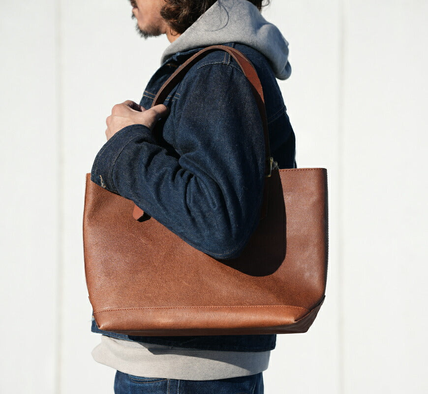 19世紀初頭、米国のアウトドアシーンで氷のブロックを運ぶ目的で使用されたトートバッグです。 ハンドルの結合部はへヴィーオンスな馬具の補強に使われる、米国製コッパーリベットを打ち込み、ヘビーデューティーに仕上げました。 ライナーは堅牢度の高いコットンオックス地を使用。A4対応のミディアムサイズです。 レザーは伝統的な手染め製法で染め上げたOLD OILレザーのラフアウトです。ラフアウトならではの荒々しくワイルドな天然繊維を磨き上げ、 オイル・コガシ加工を施して、深みのあるヴィンテージのような風合いに仕上げました。伝統的な製法でつくられる鋳物金具(真鍮無垢)、 牢度の高いコットンキャンバスライニングなどを採用し、レザーと愛称のよい風合いに仕上げました。 <素材>表地:牛革(カウレザー) / 裏地:コットン100%(キャンバス) 付属:真鍮・マグネットホック <寸法>W42cm×H28cm×D13cm <生産国>日本 <重量>1050g ![]() ![]() ブラウン ![]() キャメル ![]() ブラック ![]() ![]() ![]() ![]() 備考 サイズは実寸を計測し平均値を記載しております。若干の個体差はございますので、ご了承ください。 商品に関して 当店の取り扱い商品はヴィンテージアイテムをベースとしたデザインの商品が多数ございます。雰囲気を重視するために若干の縫製のずれ、生地の色合いや加工による風合い、色ムラなど、仕上がりが異なる場合もございますが、それらも商品の魅力としてご理解下さい。また商品の仕様(縫製・パーツ・色合い・サイズ等)は予告なく変更される場合がございます。以上の点をご理解いただいた上でお楽しみいただければ幸いです。天然素材の本来の良さを活かす為、革の表面の色ムラや古傷痕も残したまま使用しています。使用上の強度に全く問題はございません。 |