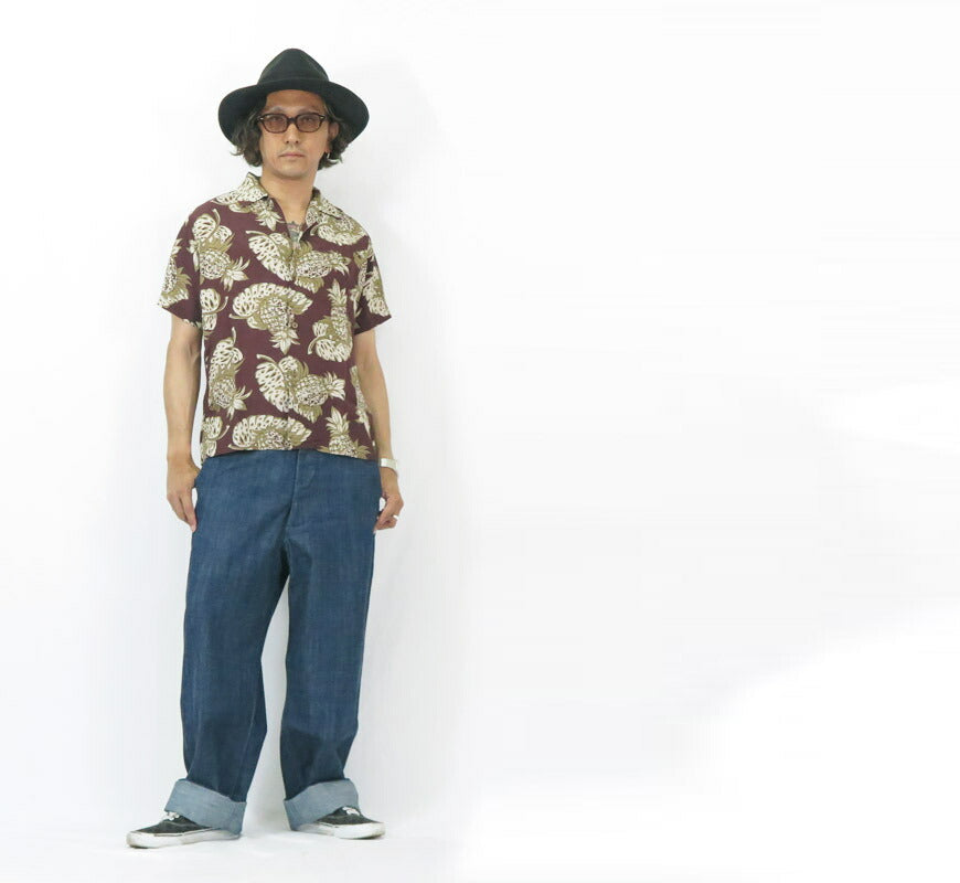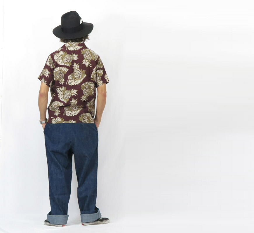 ![]() <モデル:身長175cm 体重62kg Lを着用> ヴィンテージの再来!日本唯一の地染め抜染ハワイアンシャツ 1950年ヴィンテージアロハシャツに実在した柄をリデザインしたパインリーフ柄。 当時のリゾートブームを受けてサンフランシスコからハワイまでの船での航路「マトソンライン」が 活発になったことで南国を想わせるデザインが広がった。 この風潮を反映するかのようなパイナップルデザイン柄は数多く存在しており、 中でも珍しいパインリーフ柄をデラックスウエアがリデザインしたことでスッキリとまとまったイメージに仕上げました。 また、当時を彷彿とする100%レーヨンによるフジエット素材は、 縦糸にフィラメントレーヨン、横糸にスフレーヨンを打ち込み製造しています。 このファブリックの素材感と、パインリーフデザイン柄、そして地染め抜染と呼ぶ製造手法 (生地を染色した後に柄部を脱色し着色、その後蒸して発色させる昔ならではの製造工程)を経てカタチにした本物のアロハシャツです。 地染め抜染の工程を忠実に行うかどうかにより、経年変化の表情に大きく影響することは 言うまでもありません。 現在もこの先も末永く付き合えるアロハシャツを是非御覧下さい。 重量:190g(箱含め350g) ![]() ヴィンテージウェアが創られた時代の古き哲学を基に、企画・素材開発・型紙・縫製製造・検品・商品化の全工程を自社完結する国内唯一の純国産アメカジブランド、デラックスウェア。 ![]() ブラック.ネイビー ![]() ボルドー ![]() パープル ![]() ![]() ![]() ![]() <モデル:身長175cm 体重62kg Lを着用> サイズ詳細 素材 ●素材組織:レーヨン100% ●素材表示:平織り、フジエット 経糸フィラメント120d、緯糸レーヨン30番によるフジエットファブリック。地染め後に捺染を行う地染め抜染にて製造する。 ●素材産地:福井県福井市 ●素材設備:旧式織機 生産 ●製造産地:秋田県大館(自社工場) ●加工産地:京都府京都市 秋田県大館市に構える自社工場"オルダクト"により製造。工程から数値まで証明する管理体制。 ●製造設備:UNION SPECIAL 1800s後半から1960sまでのヴィンテージミシンを多用に使用し表情と味わいを生み出す。 カラー ブラックネイビー ボルドー パープル シルエット ●型紙形状:レギュラー ●身幅形状:レギュラー ●肩幅形状:レギュラー ●特記事項:ショートスリーブ、立体アームホール 曲線で創る綺麗なボックスシルエット。独自立体アームホール型紙は動き易く着心地に優れている。 備考 ●製品状態:ONE WASH 当製品は製品の風合いや企画コンセプトにより、旧式の設備を多用し商品作りを行っております。 そのため、生産の時期や個体差、気温、湿度、お客様による洗濯乾燥環境等によって数センチの伸び縮みが発生する場合がございます。 また、同品番、同サイズの商品でも多少の個体差が生じる場合がございます。 ●洗濯種類:不可× ●アイロン:不可× ●塩素染抜:不可× 洗濯不可。クリーニング店へご相談ください。 |