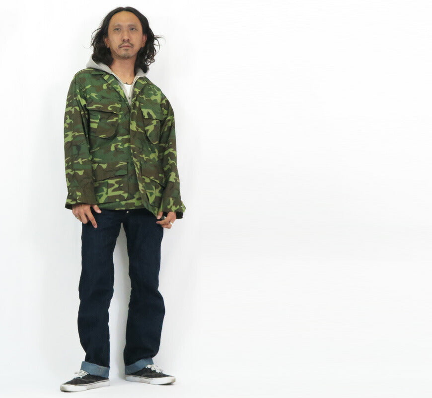 サイズの計測方法についてはこちらをご覧ください。 素材 コットン100% 生産国 日本 カラー カモフラージュ 備考 サイズは実寸を計測し平均値を記載しております。若干の個体差はございますので、ご了承ください。 商品に関して 当店の取り扱い商品はヴィンテージアイテムをベースとしたデザインの商品が多数ございます。雰囲気を重視するために若干の縫製のずれ、生地の色合いや加工による風合い、色ムラなど、仕上がりが異なる場合もございますが、それらも商品の魅力としてご理解下さい。また商品の仕様(縫製・パーツ・色合い・サイズ等)は予告なく変更される場合がございます。以上の点をご理解いただいた上でお楽しみいただければ幸いです。 |