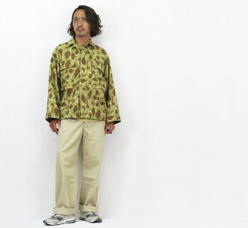 ![]() モデル:身長175cm 体重62kg 36を着用 高密度が故に強度のあるヘリンボーンツイルは戦闘服や対ガス防護服に適していた。 そのヘリンボーンツイルに迷彩効果を高めるため採用した米陸軍はカモフラージュ柄を1942年に採用した。 その生地にはグリーンサイドとタンカラーサイドと両面にプリントしているが、 リバーシブルで着用する仕様にはなっていない。胸には容量の 大きい縦長のマチ付きポケットが付き、肘は補強として二重になっている。 また、前立て裏には毒ガスを侵入させない防護として密閉性を高めるためのガスフラップが設けてある。 いずれもグリーンサイドに設置され、タンカラーサイドはプレーンな状態である。 型はこの頃採用されたオリーブドラブ色のM-43とほぼ同じ外観だが、 装備品の引っ掛かりや地上を這うことを想定してボタンは隠しボタン仕様となっている。 重量:1050g ![]() バズリクソンズはシュガーケーン・サンサーフなどヴィンテージ系アメリカンカジュアルブランドを擁する東洋エンタープライズ社のミリタリーブランドです。同社とミリタリーとの関係は古く、同社の前身企業である港商事時代に米軍ベースにスーベニアジャケット(スカジャンなど)などの商品を納入していたというルーツを持ち、1993年にはフライトジャケットのファーストを発売。以後次々と復元されるミリタリーウエアはサンサーフのハワイアンシャツ、シュガーケーンのデニムウエアーと同様、どれも完璧な出来ばえです。
