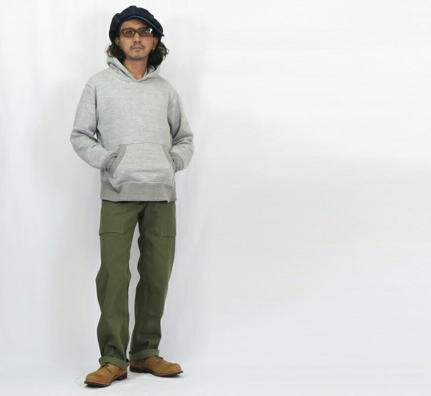 サイズの計測方法についてはこちらをご覧ください。 素材 コットン100% 生産国 日本 カラー オリーブ 備考 サイズは実寸を計測し平均値を記載しております。若干の個体差はございますので、ご了承ください。 商品に関して 当店の取り扱い商品はヴィンテージアイテムをベースとしたデザインの商品が多数ございます。雰囲気を重視するために若干の縫製のずれ、生地の色合いや加工による風合い、色ムラなど、仕上がりが異なる場合もございますが、それらも商品の魅力としてご理解下さい。また商品の仕様(縫製・パーツ・色合い・サイズ等)は予告なく変更される場合がございます。以上の点をご理解いただいた上でお楽しみいただければ幸いです。 |