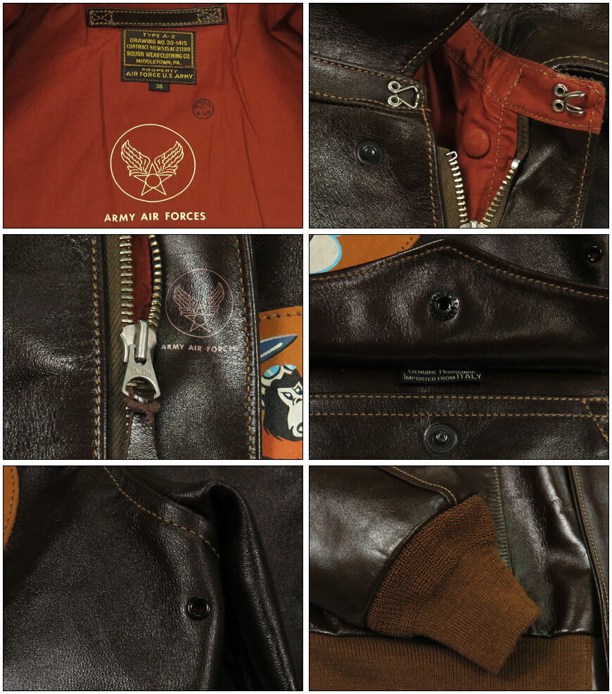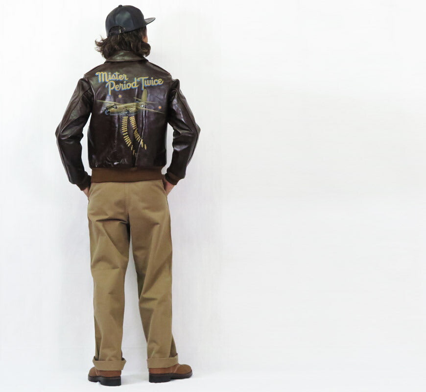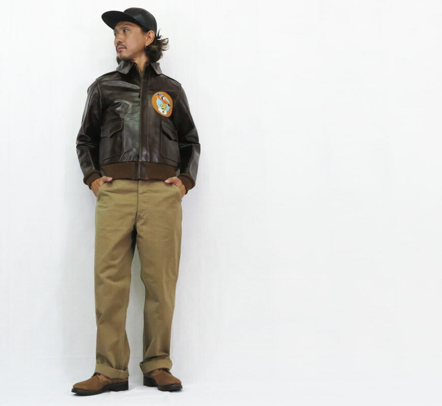 ![]() モデル 身長175センチ 体重62キログラム サイズ38を着用 A-2と言えばあまりにも有名なコントラクターのラフウェア社。 計5回の納入を果たした同社のこのモデルは1942年契約の3番目に当たる。 米陸軍航空隊は1942年の途中からプロパティー・エアフォースの表記を義務付けしたため 2マイのラベルを重ねて縫い付ける、いわゆる2段ラベルが特徴となっている。 また、台襟の付いた大型の襟などラフウェア社らしい迫力のあるフォルムを持っている。 このジャケットに使用している革は、イタリア産の原皮を樹皮から抽出したタンニン槽に漬け置きし 濃度を変えながらゆっくりと時間を掛けて鞣されている。 丹念に鞣された後、職人の手によってシールブラウンのアニリン染料が擦り込まれている。 多少の色むらがあるのは手作業ならではの証であり革の愛好家からも好まれる仕上げである。 アニリン染料で仕上げた革は、ラッカー仕上げと比較すると色に透明感があるので 使用感や経年変化で革自体に表情が出やすいのが特徴でもある。 <Bronco Hide Hand Aniline Finished> 着用による摩擦で表面が擦れ、絶妙な色のコントラストを見せる。 水分や油分を吸収しやすく、保革油のケアで艶が増す。 重量:1750g ![]() バズリクソンズはシュガーケーン・サンサーフなどヴィンテージ系アメリカンカジュアルブランドを擁する東洋エンタープライズ社のミリタリーブランドです。同社とミリタリーとの関係は古く、同社の前身企業である港商事時代に米軍ベースにスーベニアジャケット(スカジャンなど)などの商品を納入していたというルーツを持ち、1993年にはフライトジャケットのファーストを発売。以後次々と復元されるミリタリーウエアはサンサーフのハワイアンシャツ、シュガーケーンのデニムウエアーと同様、どれも完璧な出来ばえです。 ![]() ![]()