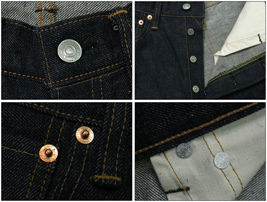 ![]() 隠しリベット部の縫い幅と上部で三角形を作る縫製仕様も当時のまま。 Lot.221Aではオフセットして縫われていたベルトループは、こちらでは中央で縫われている。 紙ラベルの縫い方にも特徴がある。帯上部のステッチで一緒に縫い付け、仮留めしてから四角形に縫う仕様。 デニムは右綾でセルビッジの白場だけ逆綾(左綾)。これは当時耳のアタリが強く出るようにと考えたもの。 縫製糸や耳のラインまで全て当時と同じ綿糸を使用。 ![]() ボタンやリベットなどは、素材や形状をアップデートしている。 生地はLot.221Aと共通。DENIME創業前、開発段階でヴィンテージのXXを解析したところ、タテ7番×ヨコ7番という数値であったが より高品質も目指し厚くしたいという考えのもと、6番×6番が最適と判断。