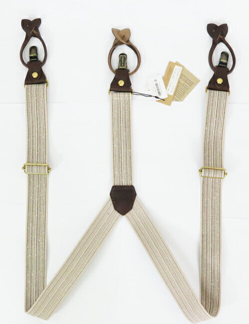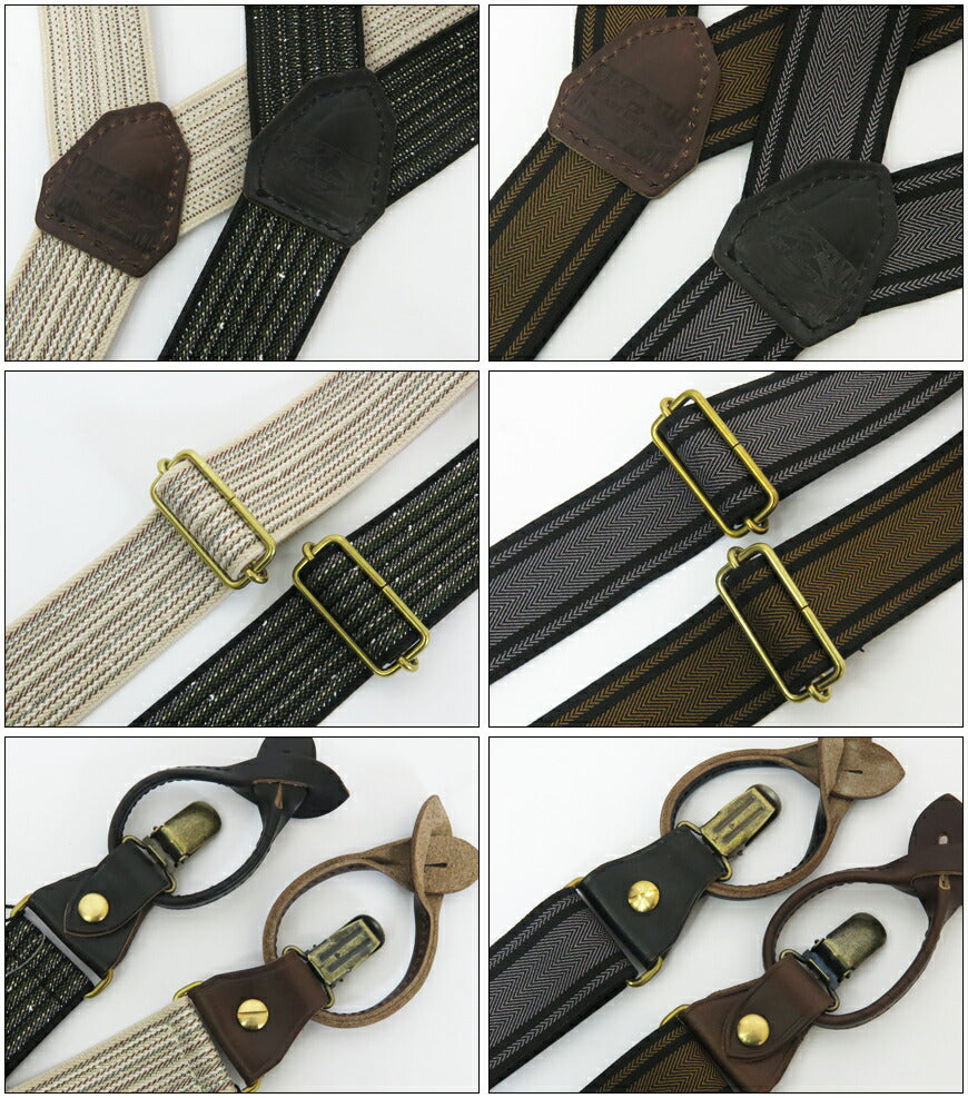 | ■ART BROWN アートブラウン ホーウィン社 クロムエクセル レザー 35mm幅 2WAY サスペンダー FGF00160AB   クロムエクセルレザーと幅広ゴムを使用したサスペンダー。 パンツを上から吊るす方式のため体型に関わらずしっかりと留めてくれるサスペンダーは、 カジュアルなシーンだけでなく綺麗に着こなしたい時にも活躍します。 クリップとボタンループの二つの留め方が選べますので、 お使いのパンツに合わせたり、ご利用シーンに合わせてお使い頂けます。 ● なで肩の方でも使いやすい35mm幅の幅広サスペンダー ● ヴィンテージな雰囲気を見せるカラー展開 ● 体型に関わらずしっかりとパンツを留める ● 使いやすいシンプルデザインのY型サスペンダー ● クリップ式・ボタン式の2WAY 【 35mm幅の幅広サスペンダー 】 肩からサスペンダーが落ちにくい35mm幅の幅広仕様。 なで肩の肩でも気にせず使いやすくなっています。 【 ヴィンテージな雰囲気を見せるカラー展開 】 カジュアルだけでなく、キレイ目なスタイルやフォーマルなシーンでもお使いいただけます。 【 クリップ式・ボタン式の2WAY 】 生地を傷めずにより洗練された着こなしになる伝統的な留め具のスタイルのボタン式と 殆どのパンツに合わせることが出来るクリップ式の2WAY使用。 アメリカの老舗タンナー、ホーウィン社のクロムエクセルレザーは 伝統的な製法でクロムとタンニンの混合鞣し、オイルをたっぷりと含み しなやかでとても馴染みが早いのが特徴。 細かい傷がつきやすいものの、革用ブラシをかけたりオイルを入れるとすぐに目立たなくなります。 また丘染めとよばれ表面だけを染めているので使い込むうちに中の茶芯が見えてくるのも魅力。 帯幅:35mm 詳細:クリップ式/最小約77cm/最大約112cm ボタン式/最小約84cm 最大約120cm 重量:180g  1974年、日本国内においてジーンズが徐々に定着しつつもジーンズに合うベルトが日本には無かった時代、 ジーンズに合う堅牢なベルトを作る工房としてアートブラウンは産声を上げました。創業当時からベルトを作る製法にこだわりハサミでは切れない程の厚さを持つ一枚革を使い、一つ一つ職人たちの手で作られるベルトをお届けしています。  モクブラック  モクホワイト  ヘリブラウン  ヘリブラック   素材 牛革 ゴム 生産国 日本 カラー チョコ ブラック   備考 サイズは実寸を計測し平均値を記載しております。若干の個体差はございますので、ご了承ください。 天然レザーを使用している為、若干のキズや色ムラがある場合がございます。 また、色が落ち着くまで、白や淡い色の洋服とのコーディネートはお控え下さい。 商品に関して 当店の取り扱い商品はヴィンテージアイテムをベースとしたデザインの商品が多数ございます。雰囲気を重視するために若干の縫製のずれ、生地の色合いや加工による風合い、色ムラなど、仕上がりが異なる場合もございますが、それらも商品の魅力としてご理解下さい。また商品の仕様(縫製・パーツ・色合い・サイズ等)は予告なく変更される場合がございます。以上の点をご理解いただいた上でお楽しみいただければ幸いです。 |