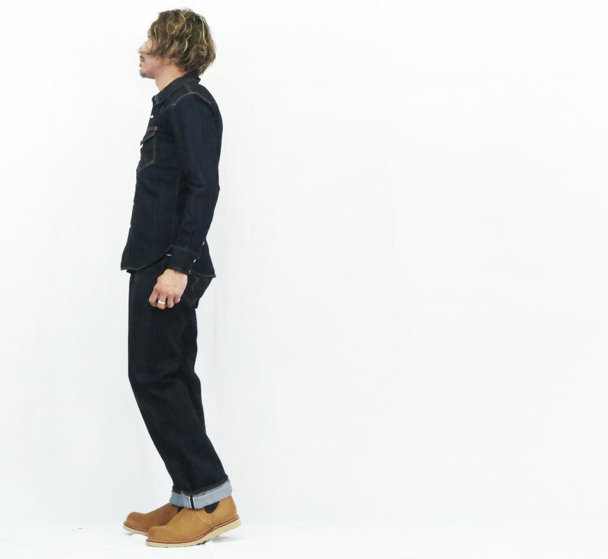 ![]() モデル:身長175cm 体重62kg 31インチを着用 ヨコ糸に太番手の糸を使用し、高密度に織り上げた18ozデニム生地を使用したジーンズ。 高密度に織り上げたハリのある生地はヘビーオンスらしい重みと硬さを楽しめるタフな穿き心地です。 特濃色で染め上げることで、経年変化もフラットヘッドらしい濃淡のメリハリが強い色落ちが楽しめます。 重みのある生地は着用時のバタつきもなくバイク用としての着用もおすすめ。 シルエットは創業当初より愛され続ける歴史のあるストレート。経年変化の魅力はもちろん、 着用時の不要なもたつきを抑えることでスッキリとしたシルエットで着用できるレギュラーストレートです。 股上がやや浅くテーパードの弱いモデルになっています。 <ヘビーオンスデニムでの巻き縫い縫製> 主要部分は巻き縫い縫製で縫い上げていますが、ヘビーオンスデニムを使用しての巻き縫い縫製は非常に難しい作業です。 生地自体の厚みに加え、重ねて巻き込むことで重なり部分はより硬く厚くなります。 この厚みを巻き縫いすると糸切れや生地の重なりがズレてしまい縫製不良になるリスクが非常に高いです。 特にバックヨーク部はパーツも多く生地の重なりも多くなるので、生地をしっかりと重ね合わせて巻き縫いを行うのは 熟練の職人でも難しい作業ですが、綺麗に巻き縫いされたヨーク部分は職人の技術力の高さを物語っています。 <中央が盛り上がったベルトループ> ベルトループの中央部分は生地を巻き込み縫製することで盛り上がりのある形に仕上げています。 この盛り上がった部分の両脇に沈み込むように入るステッチは擦り切れにくく、ベルトループの パンク(糸切れによるほつれ)を軽減しています。盛り上がり部分が擦れて色落ちすることで、 独特な経年変化の表情も楽しめるフラットヘッドの特徴的なディテールです。 <オリジナルのメタルパーツ> 経年変化やジーンズの雰囲気をより楽しめる工夫としてオリジナルのメタルパーツを使用。 ヴィンテージジーンズの質感を再現するためにオリジナルで作り上げた鉄製ボタンは着用と共に光沢感と黒みを増していきます。 ポケット部分に打ち付けられた銅製のブランドネーム入りオリジナルリベットは、だんだんと黒みがかり 鈍い金属特有の深みのある表情が現れてきます。生地と共にパーツ一つ一つも経年変化が楽しめるよう素材にもこだわっています。 <バックポケットの強度を高める隠しリベット> 鉄製のリベットに銅メッキを施したリベット。 バックポケットの強度を高めるための工夫としてリベット位置を一般的なジーンズより下に下げ、 更にリベットの脇ギリギリを縫うことで糸が沈み込み、糸切れも防ぐつくりに仕上げています。 <経年変化も楽しめる革パッチ> ジーンズの顔ともいえるパーツの一つであるパッチ。 牛革を使ったレザーパッチは、穿きこむことで現れる経年変化も楽しめます。 ※洗いにより生地のインディゴ染料が付着しているものがありますが、インディゴ染料の特性としてお楽しみください。 ・COTTON100% ・18ozデニム(旧式シャトル織機) ・股上がやや浅くテーパードの弱いストレートモデル ・鉄製ボタンフライ ・オリジナル銅リベット ・鉄製隠しリベット ・革パッチ(山羊革) 重量:1070g ![]() 古き良き50年代のアメリカンテイストを基本としつつ日本人のスタイルやファッションに合うようにアレンジした本格派アメカジブランド。コスト度外視で高いクオリティーを追及。丈夫な生地・縫製が特徴で使用者が着古す事で本当のカッコよさが生まれます。