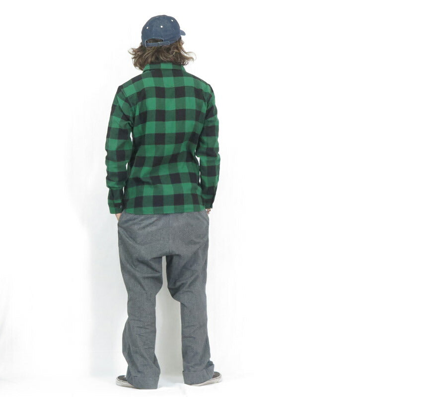 ![]() モデル:身長175cm 体重62kg 40(L)を着用 カジュアルウエアの定番ともいえるネルシャツ。 その中でも人気の高いブロックチェック柄ですが、 フラットヘッドではブロックチェック柄の中にヘリンボーン(杉綾)柄を 組み合わせたオリジナル生地を使用しています。 構成の異なる柄を組み合わせて表現するために、旧式シャトル織機の装置に改良を加えて織り上げています。 柄だけではなく、旧式シャトル織機が生み出すムラ感のある風合いや、生地自体も空気を含みやすく保温性にも優れているのが特徴です。 ブロックチェック柄にヘリンボーン柄を組み合わせた、フラットヘッド独自開発によるオリジナルのヘビーネル生地。 ヘリンボーン柄が入ることで生地の表情にも立体感が感じられます。 文字通り、中央の窪みが猫の目の様に見えるためネコ目ボタンと呼ばれています。窪みに縫製糸が沈むことで擦り切れることが少なく、 ボタンが取れにくい特徴があります。 尿素素材のボタンは、熱や衝撃に強く、耐久性に優れていますが、 生産の手間がかかるため現代では希少な素材となりつつあります。 生地の裏側はフワッとした起毛仕立てにしています。 密に立った起毛は抜群の保温力と肌触りの良さを併せ持ちます。 裾の両サイドには三角のマチを付けています。 このディテールはヴィンテージのシャツなどに見られるもので、 裾の合わせ部分を補強するために付けたと言われています。 フラットヘッドでは十分な強度を持たせ縫製をしておりますが、補強よりもデザイン的な意味でマチを付けています。 このマチの部分にもシャトル織機で織り上げた証と言える生地のミミ(端の部分)を使用しています。 生地と生地を巻き合わせて縫う『巻縫い縫製』は強度を考えて生み出されたディテール。 アームホールをはじめとするシャツを形作る主要な部分には、2本針のチェーンステッチミシンによる巻縫いを施しています。 ヴィンテージディテールのひとつ、前立て裏にはシャトル織機で織り上げた証と言える生地のミミ(端の部分)を使用しています。 重量:620g ![]() 古き良き50年代のアメリカンテイストを基本としつつ日本人のスタイルやファッションに合うようにアレンジした本格派アメカジブランド。コスト度外視で高いクオリティーを追及。丈夫な生地・縫製が特徴で使用者が着古す事で本当のカッコよさが生まれます。 ![]() ![]() グリーン×ブラック ![]() ![]() モデル:身長175cm 体重62kg 40(L)を着用 ![]() サイズ詳細 サイズの計測方法についてはこちらをご覧ください。 素材 コットン100% 生産国 日本 カラー グリーン×ブラック 備考 サイズは実寸を計測し平均値を記載しております。若干の個体差はございますので、ご了承ください。 商品に関して 当店の取り扱い商品はヴィンテージアイテムをベースとしたデザインの商品が多数ございます。雰囲気を重視するために若干の縫製のずれ、生地の色合いや加工による風合い、色ムラなど、仕上がりが異なる場合もございますが、それらも商品の魅力としてご理解下さい。また商品の仕様(縫製・パーツ・色合い・サイズ等)は予告なく変更される場合がございます。以上の点をご理解いただいた上でお楽しみいただければ幸いです。 |