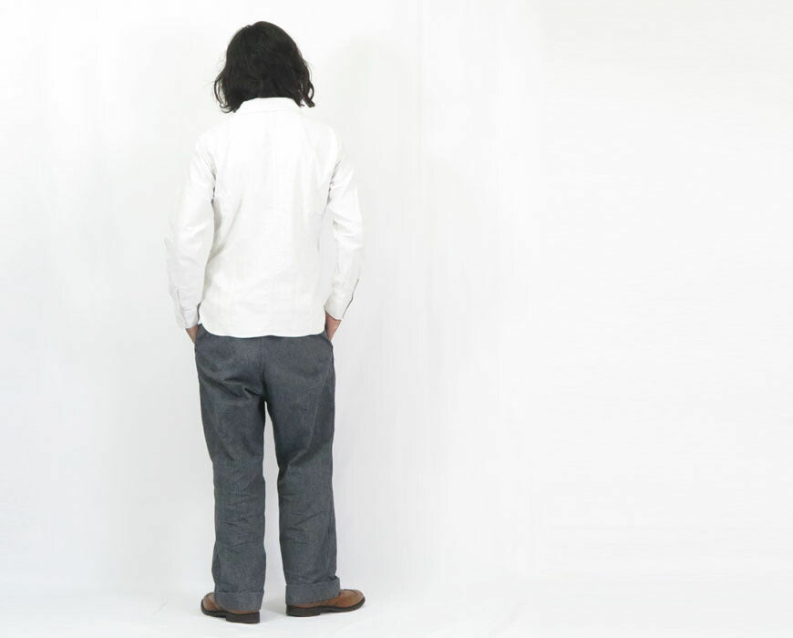 ![]() <モデル:身長175cm 体重62kg サイズ15.5(M)を着用> 古き織物名から生まれたクラシックヴィンテージシャツ 新しいダリーズ&コーの顔となる商品「ジェリコ」。3大織物と呼ばれる「綾織り」から創出した新組織を持つ、 他に類はないオリジナルファブリック「ジェルトクロス」から創るシャツです。クラシックヴィンテージを謳う デザイン性と創り込みが随所に採用され、通常のシャツに飽きた人は是非一見頂きたい商品。 兵庫県西脇市の旧式織機により製造した「ジェルトクロス」。経糸にアメリカメンフィス綿20番単糸を張り、緯 糸にコーマ糸40番双糸を打込んだ組織と、経緯異なる織り糸色で染め上げて構成される色合いのほか、右綾織り (サージ)角度を限界低角度まで変形させた組織と表情が特徴です。他にも過去にも類のないオリジナルファブリック。 型紙シルエット ●シルエット:曲線ウエストライン ●身幅形状:レギュラー ●肩幅形状:レギュラー ●特記事項:背4枚パネル この型紙は、エリを直接身頃に付けるターンカラーと曲線で創る切替とポケット・フラップ、前後差を付けたア ームホールの立体形状によりデザイン性と動き易さを追求した特殊型紙です。 ![]() ヴィンテージウェアが創られた時代の古き哲学を基に、企画・素材開発・型紙・縫製製造・検品・商品化の全工程を自社完結する国内唯一の純国産アメカジブランド、デラックスウェア。 ![]() ![]() アイボリー ![]() <モデル:身長175cm 体重62kg サイズ15.5(M)を着用>