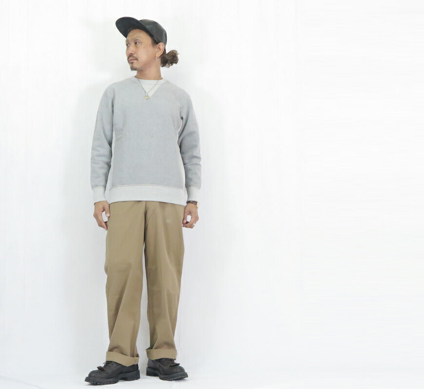 ![]() <モデル 身長175cm 体重62kg L着用> 1940sサイドパネルスウェットシャツ RVW-RV[40S SIDE PANEL] およそ1930年代から登場したとされているサイドパネルスウェット。 身生地の地の目(生地目)を90度回転させて両サイドに2重のフライスをはめ込んだ創りと 「何かの上から羽織る役割」ためのワイド寸法が特徴です。 創りやディティールを維持しつつ、現代に合わせ型紙を引き直して通常シルエットに戻しました。 20oz 限界密度の極厚吊裏毛 和歌山県和歌山市の旧式吊編機により製造する限界最高密度の吊裏毛素材。 旧式吊編機の超低速度により限界最高密度で編み上げた質感とドライな手触り、突出した高保温性が特徴です。 重量:670g ![]() ヴィンテージウェアが創られた時代の古き哲学を基に、企画・素材開発・型紙・縫製製造・検品・商品化の全工程を自社完結する国内唯一の純国産アメカジブランド、デラックスウェア。 ![]() ![]() オートミール ![]() ![]() INK.ブラック ![]() ![]() ヘザーグレー ![]() ![]() サイズ詳細 サイズの計測方法についてはこちらをご覧ください。 素材 コットン100% 生産国 素材産地:和歌山県和歌山 素材設備:旧式吊編機 製造産地:秋田県大館 製造設備:UNION SPECIAL 1960sDOUBLE NEEDLE、UNION SPECIAL 1950sFLAT SEAMER カラー オートミール INKブラック ヘザーグレー 備考 サイズは実寸を計測し平均値を記載しております。若干の個体差はございますので、ご了承ください。 商品に関して 当店の取り扱い商品はヴィンテージアイテムをベースとしたデザインの商品が多数ございます。雰囲気を重視するために若干の縫製のずれ、生地の色合いや加工による風合い、色ムラなど、仕上がりが異なる場合もございますが、それらも商品の魅力としてご理解下さい。また商品の仕様(縫製・パーツ・色合い・サイズ等)は予告なく変更される場合がございます。以上の点をご理解いただいた上でお楽しみいただければ幸いです。 |