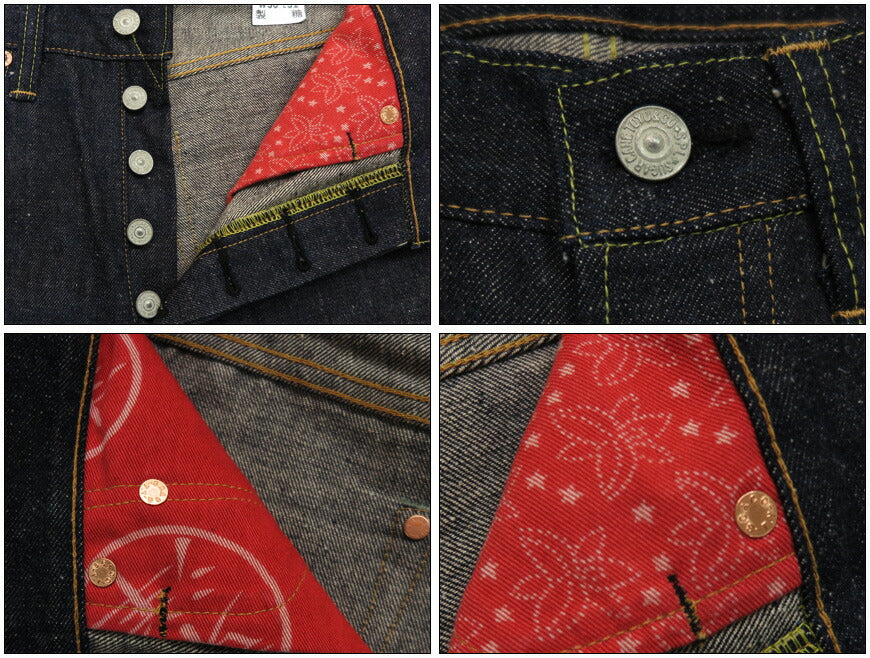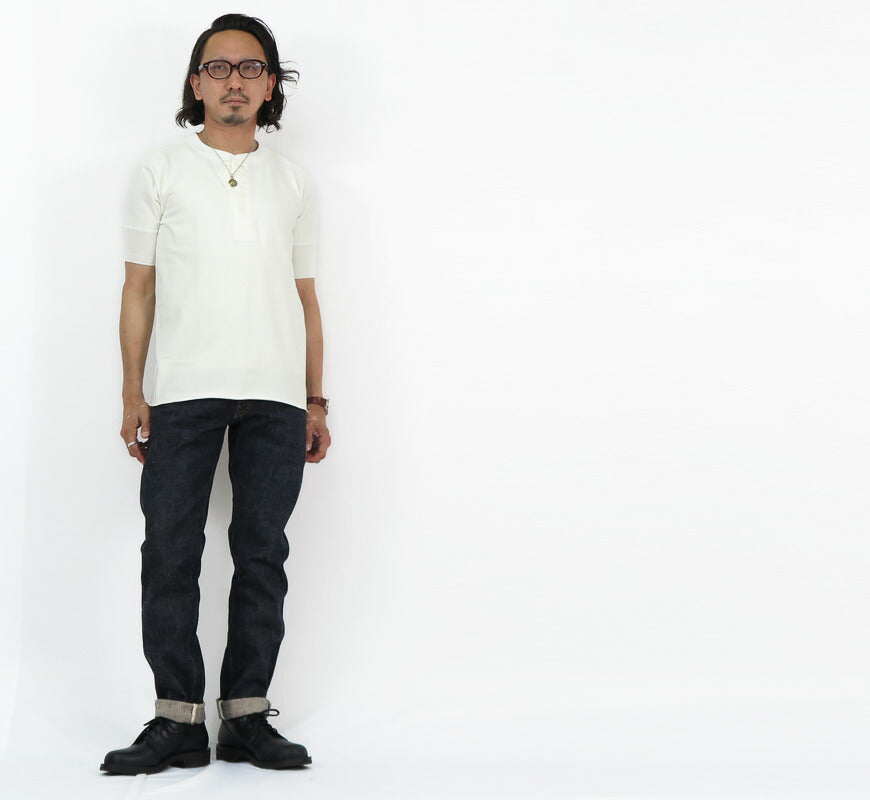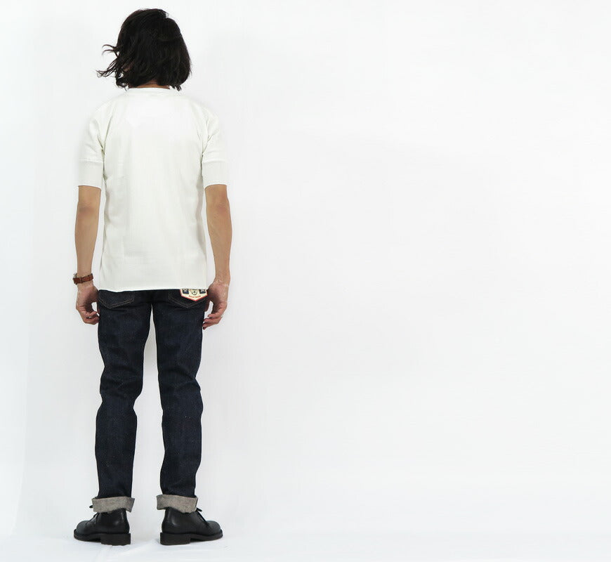 ![]() <モデル:身長175cm 体重60キログラム 30を着用> 阿波藍とインディゴをブレンドし、ヴィンテージデニム同様のロープ染色を施して 13オンスのセルビッジデニムへと仕上げた「阿波藍混デニム」の5ポケットジーンズ。 生地は砂糖黍製で、混率はコットン70%、サトウキビ30%。赤みの強い藍色と生地のネップ感が特徴。 シルエットはヒザ下からテーパードを効かせたスリムフィット。シルエットはオリジナルだが、 縫製仕様や各部のパーツ等のディテールは1940〜50年代のヴィンテージジーンズに準じている。 ポケットの袋地は草木染めを用いて茜色に抜染プリントした特製のスレキを採用している。 レザーパッチは鹿革製の本藍染め。同じデニム生地を使用したジャケットとセットアップで着用可能。 ![]() 長年に渡り、徹底したこだわりのボタンダウンウエアーを作り続けているSUGAR CANE(シュガーケーン)は、バズリクソンズ・サンサーフなどフライトジャケットやコレクタブルハワイアンシャツブランドを擁する、東洋エンタープライズ社のヴィンテージアメリカンカジュアルウエアーの老舗的ブランドです。