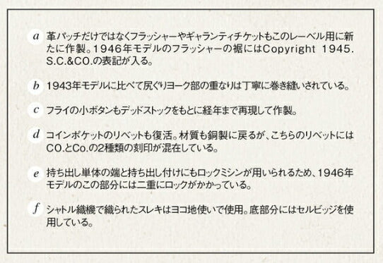 ![]() <モデル:身長175cm 体重62キログラム 30を着用> ※着用しているのはノンウォッシュ状態です。お洗濯をすると縮みが生じます。 "FOR THE DURATION"から"Copyright 1945"フラッシャーに代わりオリジナルの刻印入りのボタンや コインポケットのリベットが復活しつつも生地の風合いやディテールに大戦期の名残がある1946年モデル。 規制が解除された後のモデルなので品番の頭にはSが付けられていない。生地は1943年モデルに比べてやや大人しめだが 大戦後期らしく後のデニムに比べると荒々しい仕上がり。切りっぱなしだった腰ポケット向布の一部や小股部分は折伏せに、 フライの脇は身頃と一緒にロックをかけられているものの裾部分は切りっぱなしのままになっている。2本針の数ヶ所に ややオレンジがかったイエローを使用。リベットは銅製の刻印入りで、CO.とCo.の2種類が混ざって使用されている。 <SUGAR CANE Super Denim Collectibles> シュガーケーンの福富雄一が中心となり、デニムのスペシャリストたちを集結させて始動する新レーベル、SUGAR CANE Super "Denim" Collectibles。通称「SCSC」。今回、世界有数のヴィンテージデニムコレクターである脇谷重輝氏を迎え、いまや入手不可能といえるほどの価値を持ったデッドストック&ゴールデンサイズのスーパーヴィンテージをもとに、その貴重な個体が持つ「個性」を完全再現する。 ![]() 長年に渡り、徹底したこだわりのボタンダウンウエアーを作り続けているSUGAR CANE(シュガーケーン)は、バズリクソンズ・サンサーフなどフライトジャケットやコレクタブルハワイアンシャツブランドを擁する、東洋エンタープライズ社のヴィンテージアメリカンカジュアルウエアーの老舗的ブランドです。 ![]()