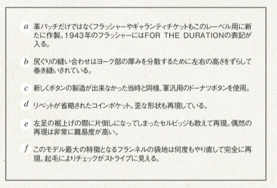 ![]() <モデル:身長175cm 体重62キログラム 30を着用> ※着用しているのはノンウォッシュ状態です。お洗濯をすると縮みが生じます。 ムラが強い極めて荒々しいデニム生地や軍汎用のドーナツボタン、鉄リベットの使用、オールイエローステッチなど、 第二次大戦期の戦況上、米国内産業の物資統制が最も過酷を極めた1943年度のモデル。コインポケットのリベットは省略され、 コンシールリベットはメッキされておらず鉄材の色のままになっている。また袋地にはネル生地が使用されており、 コットン削減を如実に体現している。そして熟練工不足からか縫製が非常に粗雑で、ステッチの幅が一定ではなく、 後ろ中心のヨーク部の縫い合わせがずれていたり、左脇の縫い代が片倒しのまま裾上げされてしまっていたりなど、 平常時であれば検品ではじかれるレベルの仕上がりとなっている。 <SUGAR CANE Super Denim Collectibles> シュガーケーンの福富雄一が中心となり、デニムのスペシャリストたちを集結させて始動する新レーベル、SUGAR CANE Super "Denim" Collectibles。通称「SCSC」。今回、世界有数のヴィンテージデニムコレクターである脇谷重輝氏を迎え、いまや入手不可能といえるほどの価値を持ったデッドストック&ゴールデンサイズのスーパーヴィンテージをもとに、その貴重な個体が持つ「個性」を完全再現する。 ![]() 長年に渡り、徹底したこだわりのボタンダウンウエアーを作り続けているSUGAR CANE(シュガーケーン)は、バズリクソンズ・サンサーフなどフライトジャケットやコレクタブルハワイアンシャツブランドを擁する、東洋エンタープライズ社のヴィンテージアメリカンカジュアルウエアーの老舗的ブランドです。 ![]()