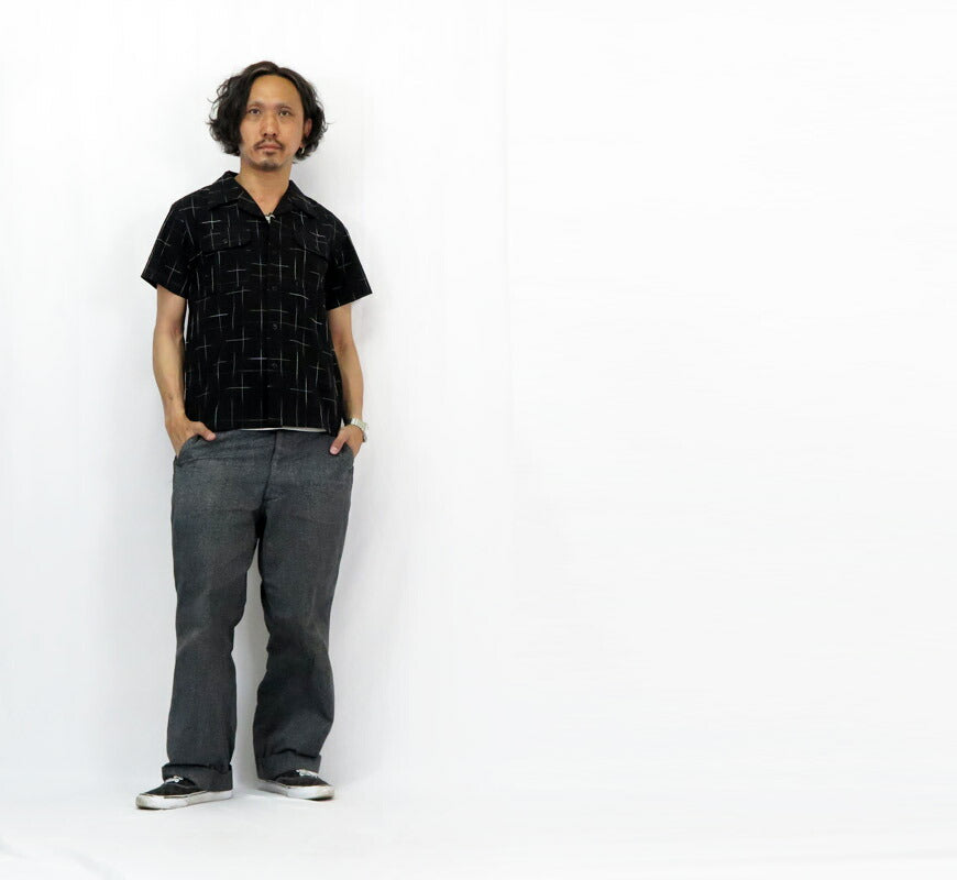 ![]() <モデル:身長175cm 体重62kg 38を着用> 黒紋付染による絣半袖シャツです。 化学繊維糸の絣柄部分のみ色が残るように工夫されたオリジナル生地になります。 黒紋付染で染める事により オイルを含んだようなしっとりとした素材感へと変化していきます。 京黒紋付が追い求めた黒、 それは実質的な黒の色だけではない日本人の気持ちを律する精神の力の色なのだと思います。 播州の織職人と京黒紋付染職人の 飽くなき追求によって生まれた『究極の黒』をお楽しみ下さい。 ![]() 1979年創立したステュディオ・ダ・ルチザンの名には職人工房という意味が込められている。 当時の日本のジーンズマーケットには現在のビンテージレプリカと呼ばれるジーンズ作りの概念はほとんど存在しなかった。大量生産を目的とした効率化の影でジーンズ本体の味を再現する事に夢を追い求めるモノ作りの基盤を作り上げた草分け的ブランドです。 ![]() ![]()