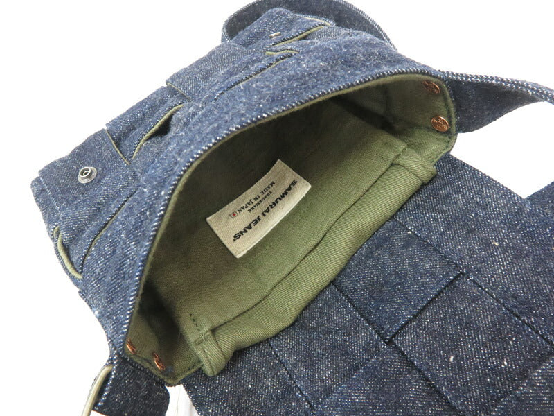 SJDCB25 デニムカセットバッグ 15oz男気セルビッチデニムによるデニムカセットバッグです。 デザインはデニム格子状に編み込んだ仕様でカセット型のイメージです。 内側に小ポケットが付属し小物等が収納可能な仕様になります。日常使いから色々な用途でご活用頂けます。 SPEC:15oz男気セルビッチデニム/オリーブスレーキ/サムライスナップボタン/サムライリベット/日の丸ネーム/日本製 ![]() 1998年に大阪で創業。「ジーンズは作り手、穿き手のこだわりが一致しないと商品価値が無い」をコンセプトに次々と革新的な商品を発表し続け、業界のリードしている。その名の通りサムライをモチーフにしたデザインが多く、その中でも20オンスを超える超極厚デニムはブランドの代名詞的存在となっている。 ![]() ![]()