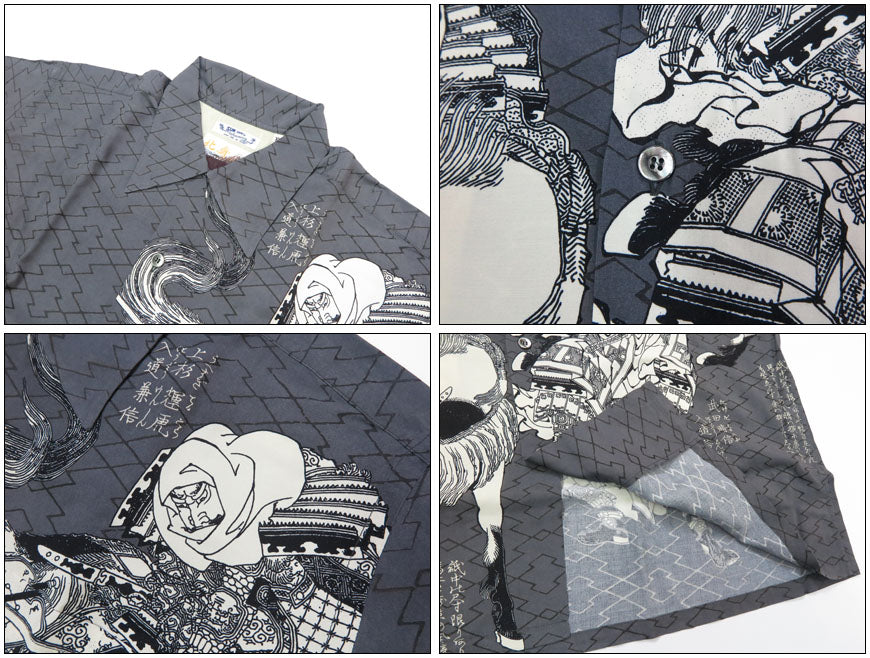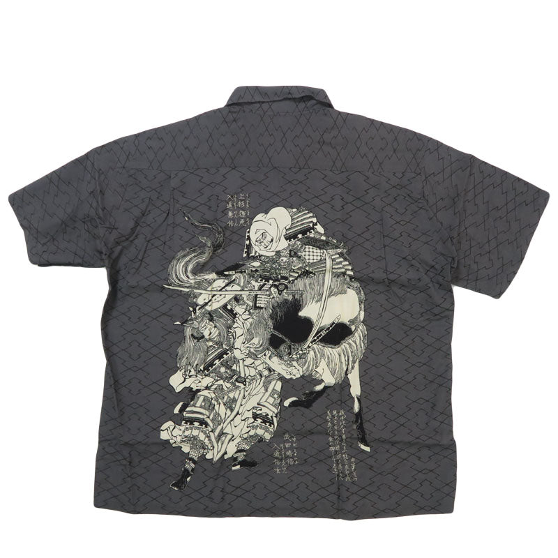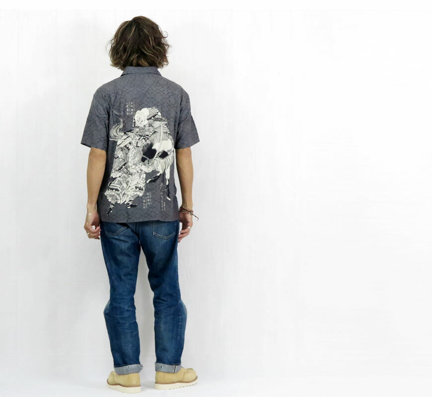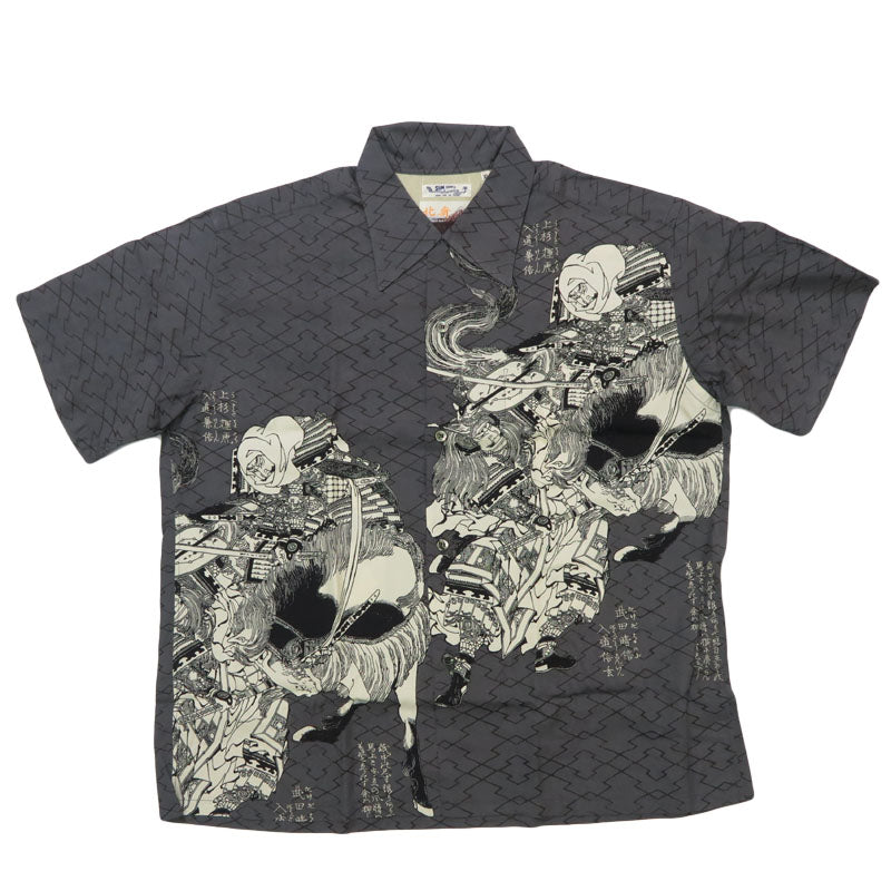 ![]() <モデル:身長175cm 体重62kg Lを着用> 画本武蔵鐙(えほんむさしあぶみ)は日本武尊(やまとたけるのみこと)にはじまり、 上杉謙信、武田信玄、宮本武蔵、佐々木小次郎など、日本の名高い武者を描いた武者絵本。 本図は、歴史に刻まれた川中島の戦い(1553 ~ 1564年)の名場面として伝わる上杉謙信と武田信玄の一騎打ちを描いたものである。 軍学書『甲陽軍鑑』(こうようぐんかん)には、両名の一騎打ちの様子について「川中島の戦いの第四次合戦(1561年)で混戦のなか、 白手ぬぐいで頭を包んだ武者が馬に乗って太刀を抜き、床几(しょうぎ)に座っていた信玄めがけ突進して切りつけてきたので、 信玄は立って軍配で受けた」と記されている。北斎はこの場面を非常に緻密に描き、画面を見開きで縦に使うことで迫力を演出している。 <日本の意匠 National Treasure of Japan> 日本の文化芸術がさらなる広がりをみせた江戸時代の絵師たちに焦点を当て、 アロハシャツというキャンバスに巨匠たちの作品を再現し、 日本が世界に誇る意匠(デザイン)に込められた情熱を現代に蘇らせる。 河鍋暁斎の作品とのコラボレーションから始まったこのシリーズは 新たなアーティストを加え、次なる展開を迎える。 作品名: "画本武蔵鐙(えほんむさしあぶみ)" 作者:葛飾北斎(かつしかほくさい) / 天保7年(1836年)/ 半紙本 <すみだ北斎美術館所蔵> 素材: レーヨンフジエット プリント: オーバープリント ボタン: 黒蝶貝ボタン ●オーバープリント 淡い地色により強い色を重ねていく手法。抜染と比べて使える色数が多く、 境目の色が重なるためグラデーションが美しく見える。 和柄のような写実的な絵柄向きだ。 ●レーヨンフジエット 経糸フィラメントレーヨン、緯糸にスパンレーヨンを使用した平織りの布地。 富士絹に似たしなやかさと、レーヨン特有の風合いを併せ持つ。 表面の毛羽感もフジエットの特徴。 パッケージ含む総重量:480g ![]() サンサーフは、東洋エンタープライズのアロハシャツ専門ブランドです。サンサーフのアロハシャツは、すべてヴィンテージとしてかつて実在したデザインのものを当時の風合いそっくりにレプリカしています。他では真似できない膨大な量の社内コレクション、ノウハウがあって初めて可能となる製品造り。コレクターの方から、アロハを初めて着る方まで、幅広くオススメできるブランドです。 ![]() ![]() 119ブラック ![]() ![]() <モデル:身長175cm 体重62kg Lを着用> ![]() ![]() サイズ詳細