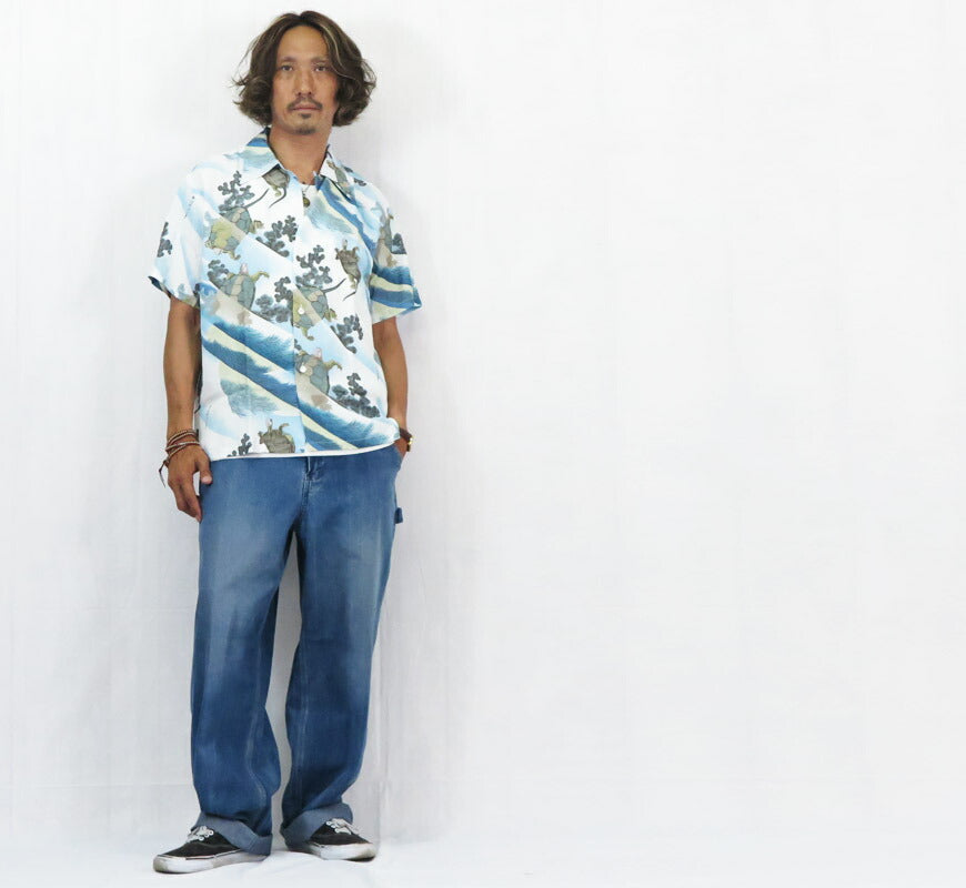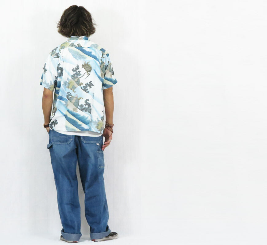 ![]() <モデル:身長175cm 体重62kg Lを着用> 吉祥を題材とした北斎の花鳥画シリーズ。この「亀」以外に「桜花に鷹」「鯉の滝登り」「雪松に鶴」「牧馬」などがある。 本作では画面を斜めに横切る青色のぼかしで揺蕩う水の流れを表現し、水中を漂う3 匹の亀を上から覗き込むような構図で描写。 甲羅に藻がついた一番下の「蓑亀(みのがめ)」は長寿の象徴で、親亀とともに子亀、孫亀も描かれており、 子孫繁栄を表現している。またこの花鳥画シリーズは長大判と呼ばれる縦長の判型で、吉祥の掛軸の代わりとして制作された。 実物を見ると、北斎は水面の青い部分に藍顔料を用いている。それに倣い、このシャツも藍顔料を使って捺染しているのが特徴。 また当時、亀の頭の部分には銀が使われていたが、シャツ用としては適さないため実物の色合いに近い銀色の顔料を使用している。 <日本の意匠 National Treasure of Japan> 日本の文化芸術がさらなる広がりをみせた江戸時代の絵師たちに焦点を当て、 アロハシャツというキャンバスに巨匠たちの作品を再現し、 日本が世界に誇る意匠(デザイン)に込められた情熱を現代に蘇らせる。 河鍋暁斎の作品とのコラボレーションから始まったこのシリーズは 新たなアーティストを加え、次なる展開を迎える。 作品名: 亀(かめ) 作者: 葛飾北斎(かつしかほくさい)/ 天保5年(1834年)頃 / 長大判錦絵 素材: レーヨンフジエット プリント: オーバープリント ボタン: 白蝶貝ボタン ●オーバープリント 淡い地色により強い色を重ねていく手法。抜染と比べて使える色数が多く、 境目の色が重なるためグラデーションが美しく見える。 和柄のような写実的な絵柄向きだ。 ●レーヨンフジエット 経糸フィラメントレーヨン、緯糸にスパンレーヨンを使用した平織りの布地。 富士絹に似たしなやかさと、レーヨン特有の風合いを併せ持つ。 表面の毛羽感もフジエットの特徴。 パッケージ含む総重量:480g ![]() サンサーフは、東洋エンタープライズのアロハシャツ専門ブランドです。サンサーフのアロハシャツは、すべてヴィンテージとしてかつて実在したデザインのものを当時の風合いそっくりにレプリカしています。他では真似できない膨大な量の社内コレクション、ノウハウがあって初めて可能となる製品造り。コレクターの方から、アロハを初めて着る方まで、幅広くオススメできるブランドです。 ![]() ![]() 101ホワイト ![]() <モデル:身長175cm 体重62kg Lを着用>