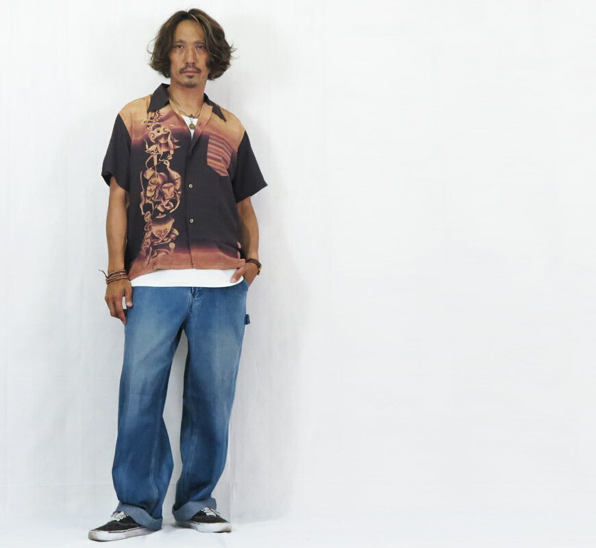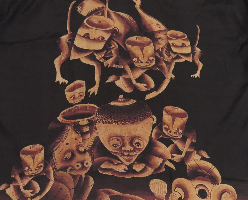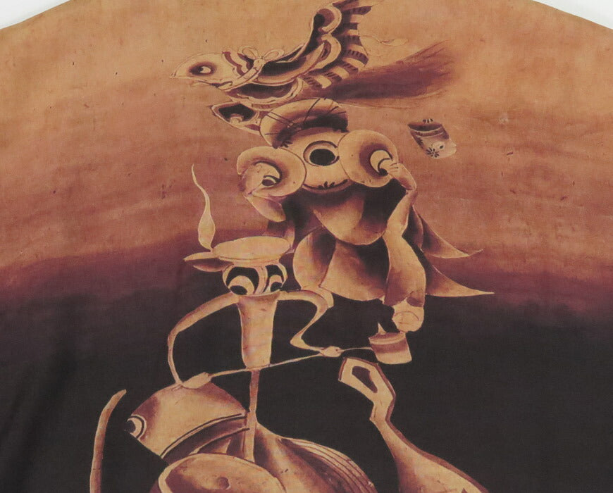 ![]() <モデル:身長175cm 体重62kg Lを着用> 日本に古くからある言い伝えに「百年を経た器物には神や精霊が宿り人々にイタズラをする」というものがある。 そのような民間信仰から、器物に宿った精霊を付喪神(つくもがみ)と呼ぶようになり、妖怪画として表現されていった。 それらは人に恐怖を与えるために描かれた幽霊画と異なり、親しみやすい画風が多いのも特徴。 本作の題材となった伊藤若冲の『付喪神図』に登場する妖怪たちにも、そのような特徴が見受けられる。 グラデーションで表現された薄明かり。そして、ぼんやりと光があたる闇の空間で列をなす付喪神たち。 前の方は茶釜や水指、茶碗など長年使い込まれた茶道具の妖怪で、それらに続き燭台や 鳥兜(舞楽で用いられる鳳凰の頭かたどった装飾品)、琵琶や皷など、様々な器物の付喪神が登場している。 伊藤若冲は1716年、京都の青物問屋に生まれるが、絵を描くこと以外に興味が無く、家業を放棄して山に籠ることもあった。 その類稀なる才能は奇抜な発想として作品に現れ、現代でも人々を魅了している。今回、伊藤若冲の作品を アロハシャツとして表現するにあたり、原画名を冠した「付喪神図」では、前後の違いを楽しめるよう 強弱をつけてモチーフを配置。落款や外枠の縞模様なども加え、1950年代のテイストに仕上げた。 <日本の意匠 National Treasure of Japan> 日本の文化芸術がさらなる広がりをみせた江戸時代の絵師たちに焦点を当て、 アロハシャツというキャンバスに巨匠たちの作品を再現し、 日本が世界に誇る意匠(デザイン)に込められた情熱を現代に蘇らせる。 河鍋暁斎の作品とのコラボレーションから始まったこのシリーズは 新たなアーティストを加え、次なる展開を迎える。 作品名: 付喪神図(つくもがみず) 作者: 伊藤若冲(いとうじゃくちゅう)/ 江戸時代(18 世紀)/ 紙本墨画 素材: レーヨンフジエット プリント: オーバープリント ボタン: 茶蝶貝ボタン ●オーバープリント 淡い地色により強い色を重ねていく手法。抜染と比べて使える色数が多く、 境目の色が重なるためグラデーションが美しく見える。 和柄のような写実的な絵柄向きだ。 ●レーヨンフジエット 経糸フィラメントレーヨン、緯糸にスパンレーヨンを使用した平織りの布地。 富士絹に似たしなやかさと、レーヨン特有の風合いを併せ持つ。 表面の毛羽感もフジエットの特徴。 パッケージ含む総重量:480g ![]() サンサーフは、東洋エンタープライズのアロハシャツ専門ブランドです。サンサーフのアロハシャツは、すべてヴィンテージとしてかつて実在したデザインのものを当時の風合いそっくりにレプリカしています。他では真似できない膨大な量の社内コレクション、ノウハウがあって初めて可能となる製品造り。コレクターの方から、アロハを初めて着る方まで、幅広くオススメできるブランドです。 ![]() ![]() 138ブラウン ![]() <モデル:身長175cm 体重62kg Lを着用>