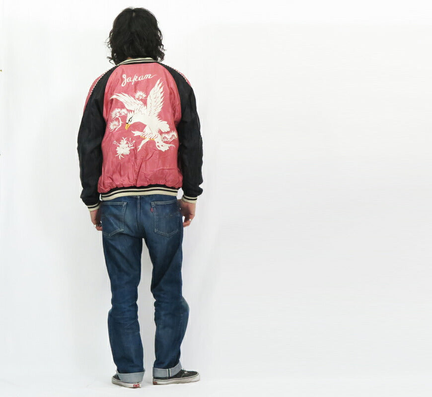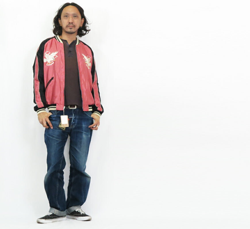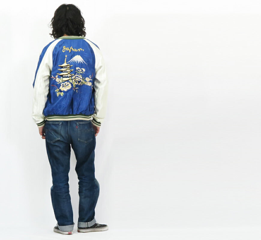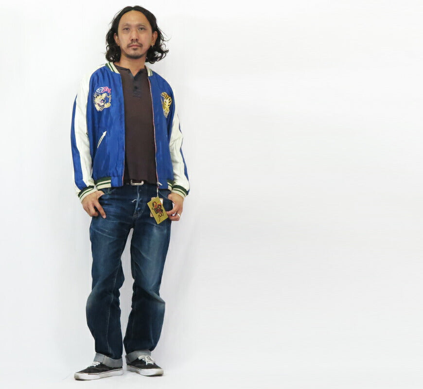 ![]() モデル:身長175cm 体重62kg Lを着用 表面はピンク×ブラックで、身頃より袖下の色の方が濃い通称「逆配色」と呼ばれるヴィンテージでもレアな一着。 白を基調とした色糸で翼を広げる鷲を描写した1950年代初期の作品を再現しており、 光沢のあるレーヨン糸の特徴を生かして刺繍の針足で立体感と躍動感を表現している。 背中の左下には桜が描かれているが、松と桜を組み合わせた鷲柄は珍しい。 リバーシブル面は晴天を想わせるブルーのボディに日本の情景が広がるランドスケープ柄。 その中でも「牡丹の花」をモチーフにした作品は非常に珍しく、背景に五重塔とまだ雪の残る富士山をのぞむ、 春の美しい風景を描き出している。胸のデフォルメされた龍虎は愛らしく、 ボディの配色と関連性の無いグリーンのリブも当時のスカジャンらしさを強調している。 <ACETATE SOUVENIR JACKET> スーベニアジャケットのなかで最もスタンダードな両面にアセテート生地を使ったリバーシブルタイプ。 戦後当時のスカジャンには、シルクに似た高級感を持つ物資統制外品目のアセテートが使われていた。 中綿がないため季節を問わず着用でき、独特なドレープ感も魅力といえる。 重量:720g ![]() スカジャン誕生当時から米軍キャンプに納品していた老舗ブランド。 スカジャンのトップブランドとして常に業界をリードしています。 また、シュガーケーンやバズリクソンズなど完璧な出来栄えのアイテムを毎年沢山発表しています。 ![]()