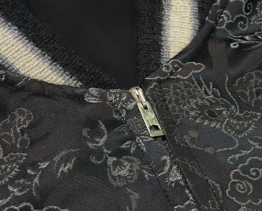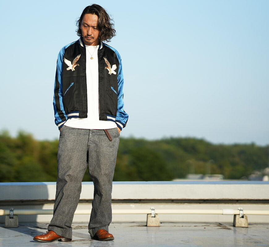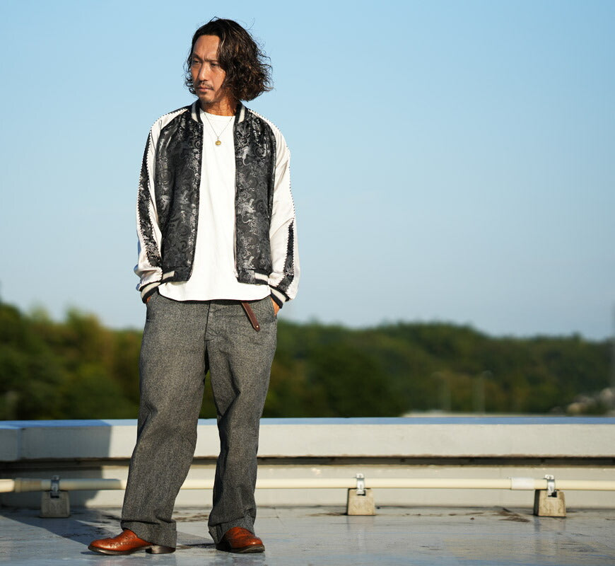 ![]() <モデル 身長175cm 体重62kg 特大(XL)着用> 東洋エンタープライズの60周年を記念したもうひとつのスペシャルエディションが、この「ブロケード」のスーベニアジャケット。 数あるヴィンテージスカジャンのなかでも極めて希少な、刺繍ではなく「織り」で絵柄が表現された作品である。 ブラックのボディに輝くシルバーの糸で描かれているのは日本古来のモチーフである笹と虎、そして雷雲と龍。 1950年代初期ごろ、スカジャンのバリエーションのひとつとして、群馬県の桐生や山梨県富士吉田の郡内など関東の 歴史ある織物の産地で織られたブロケード生地が用いられていた。 スーパーレアとされる髑髏柄やハンドプリントよりもさらに珍しい、ウルトラレアなコレクター垂涎の一着である。 リバーシブル面は、大きく翼を広げる鷲が描かれたスカジャンらしい刺繍の絵柄。松の枝の独特なタッチ、 鷲の目を強調する赤いライン、クチバシや爪、羽先の躍動感あふれる曲線の表現からは、 当時の刺繍職人の高度な技術とセンスを垣間見ることができる。歴史的価値のみならず芸術性も高い逸品。 <KOSHO CO. SPECIAL EDITION> テーラー東洋のコレクションの中でも特に厳選した逸品をディテールにこだわり再現するのが、このスペシャルエディション。 横振り刺繍で緻密に描かれた図案はもとより、アセテート生地の打ち込みを調整してヴィンテージと遜色なく仕上げ、 ウールリブも旧式の横編み機を使用して1着ずつ編み上げている。リバーシブル仕様のファスナーについても50年以上前の ファスニング機械を再稼働させ、当時と同じ手曲げのものを再現。テーラー東洋の前身である港商(こうしょう)商会のラベルを使い、 ヴィンテージスカジャンの最盛期を彷彿とさせる仕上がりとなっている。 重量:690g ![]() スカジャン誕生当時から米軍キャンプに納品していた老舗ブランド。 スカジャンのトップブランドとして常に業界をリードしています。 また、シュガーケーンやバズリクソンズなど完璧な出来栄えのアイテムを毎年沢山発表しています。 ![]()