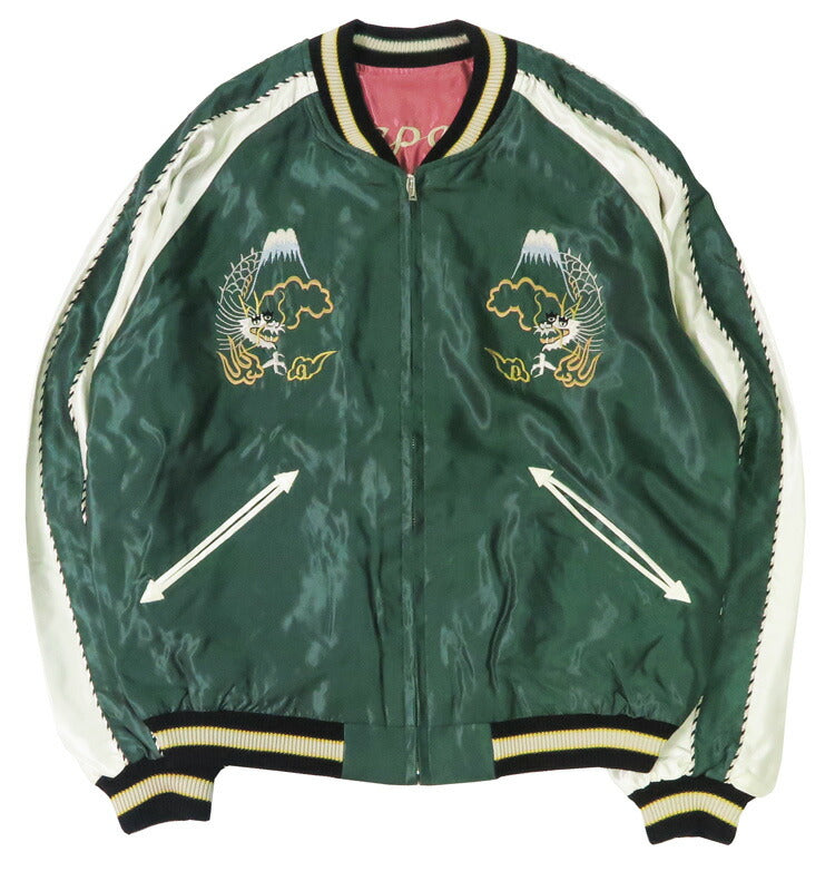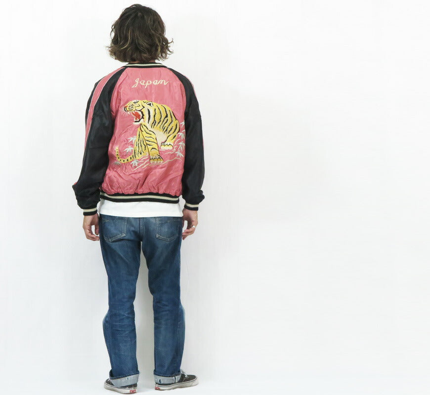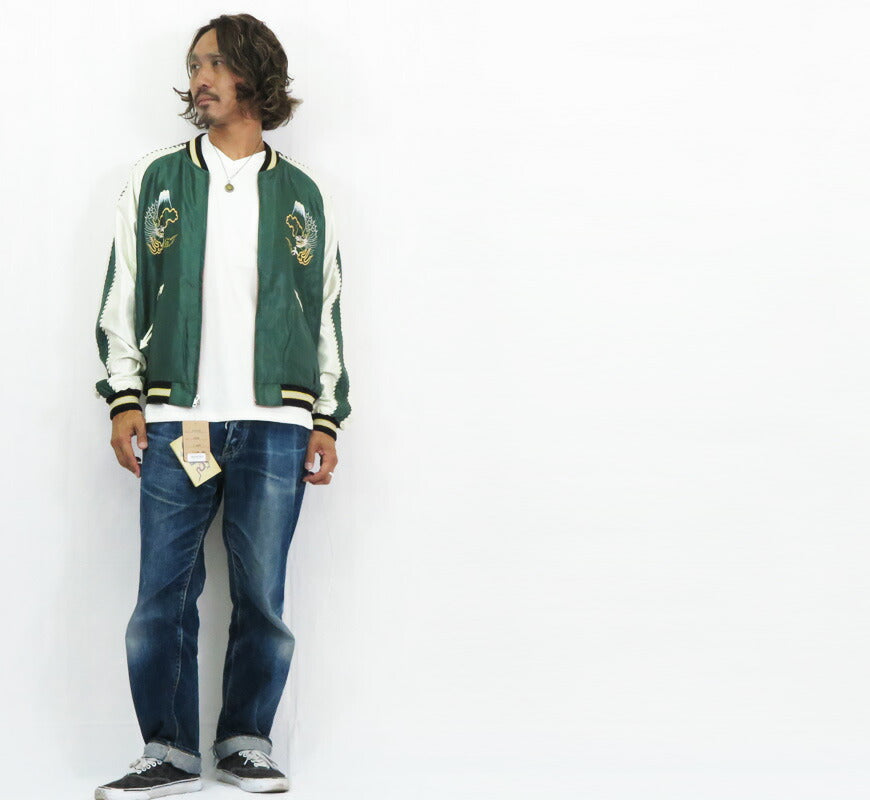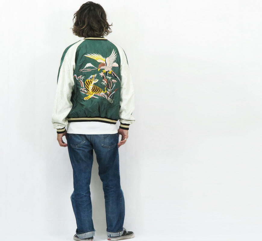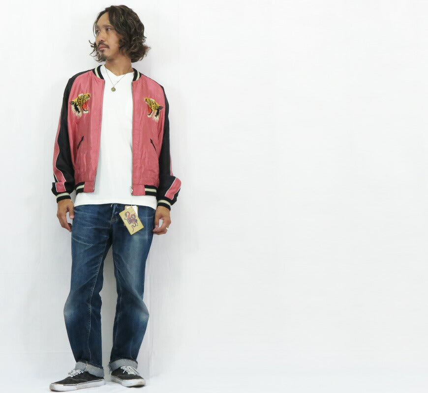 ![]() モデル:身長175cm 体重62kg XLを着用 表面はヴィンテージスカジャンの中でも珍しい、鷲と虎が睨み合う1950年代中期の絵柄。Japanの文字が無いため、 デフォルメしたそれぞれのモチーフを主役級の大きさで刺繍しているのが特徴。鷲の翼のグラデーションや虎の縞模様は、 カラフルな色糸を駆使して緻密に描写。胸の龍は生地のグリーンを生かし、細いラインで繊細に表現されている。 リバーシブル面はスカジャンの王道として人気も高い、咆哮する虎の絵柄。振り幅の狭い横振り刺繍で筋骨隆々な 虎の体躯を写実的に描写しており、これは優れた技術を持つ熟練の職人にしか成し得ない業である。 ボディは身頃より袖下の色の方が濃い、通称「逆配色」。ピンク×ブラックの組み合わせは フィフティーズカルチャーにおいて絶大な評価を得ている。 <ACETATE SOUVENIR JACKET> スーベニアジャケットのなかで最もスタンダードな両面にアセテート生地を使ったリバーシブルタイプ。 戦後当時のスカジャンには、シルクに似た高級感を持つ物資統制外品目のアセテートが使われていた。 中綿がないため季節を問わず着用でき、独特なドレープ感も魅力といえる。 重量:720g ![]() スカジャン誕生当時から米軍キャンプに納品していた老舗ブランド。 スカジャンのトップブランドとして常に業界をリードしています。 また、シュガーケーンやバズリクソンズなど完璧な出来栄えのアイテムを毎年沢山発表しています。 ![]()