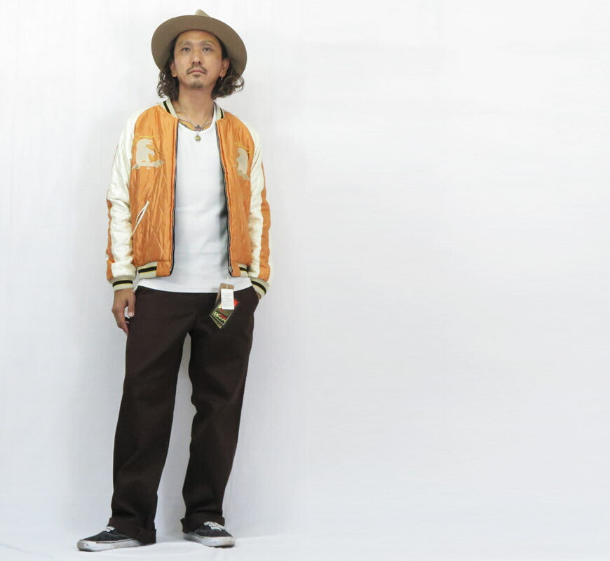 サイズ詳細 サイズの計測方法についてはこちらをご覧ください。 素材 表地:コットン100% 裏地:アセテート100% 中綿:コットン80% ポリエステル20% 刺繍部分:レーヨン100% リブ:アクリル100% カラー 表面:ブラック 裏面:オレンジ 備考 デリケートな素材なのでお洗濯はクリーニング店にご相談下さい。 ヴィンテージの風合いを再現した緻密な刺繍の為、多少の糸飛びやホツレがございます。 商品の特性としてご理解下さい。 サイズは実寸を計測し平均値を記載しております。若干の個体差はございますので、ご了承ください。 商品に関して 当店の取り扱い商品はヴィンテージアイテムをベースとしたデザインの商品が多数ございます。雰囲気を重視するために若干の縫製のずれ、生地の色合いや加工による風合い、色ムラなど、仕上がりが異なる場合もございますが、それらも商品の魅力としてご理解下さい。また商品の仕様(縫製・パーツ・色合い・サイズ等)は予告なく変更される場合がございます。以上の点をご理解いただいた上でお楽しみいただければ幸いです。 |