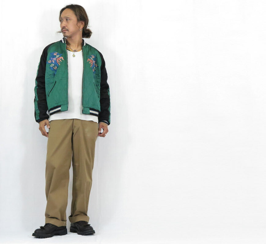 ![]() <モデル 身長175cm 体重62kg 特大(XL)着用> 東洋エンタープライズの60周年を記念し、ヴィンテージではウルトラレアとされるステンシルが施されたスーベニアジャケットを復刻。 当時、スカジャンと同様に横振り刺繍が施されたクッションカバーも米兵の土産物として好まれ、そのバリエーションとして 刺繍とステンシルを組み合わせたものが存在する。しかし、ジャケットとして仕立てられたものは極めて珍しく、 まさしくスペシャルな一着。刺繍は1950年代中期の「タイガーヘッド」と呼ばれる絵柄で、白虎の顔の周りにはブルーのステンシルが噴かれ、 黒い別珍から浮き出てくるかのような迫力。うねる鬣は何度も針足を変えながら一本一本丁寧に描かれ、血走った瞳は赤い刺繍糸で強調されている。 リバーシブル面は、身頃よりも袖下の色が濃い「逆配色」。鮮やかなグリーンのボディに描かれるのは、翼を広げた鷲、 そして立派な枝ぶりの松の木。盆栽などにも通じる、力強い樹形を鑑賞して愛でる日本の美が表現されている。 当時も今も、職人の卓越した技術がなければ生み出せない圧巻の作品。 <KOSHO CO. SPECIAL EDITION> テーラー東洋のコレクションの中でも特に厳選した逸品をディテールにこだわり再現するのが、このスペシャルエディション。横振り刺繍で緻密に描かれた図案はもとより、アセテート生地の打ち込みを調整してヴィンテージと遜色なく仕上げ、ウールリブも旧式の横編み機を使用して1着ずつ編み上げている。リバーシブル仕様のファスナーについても50年以上前のファスニング機械を再稼働させ、当時と同じ手曲げのものを再現。テーラー東洋の前身である港商(こうしょう)商会のラベルを使い、ヴィンテージスカジャンの最盛期を彷彿とさせる仕上がりとなっている。 重量:1010g ![]() スカジャン誕生当時から米軍キャンプに納品していた老舗ブランド。 スカジャンのトップブランドとして常に業界をリードしています。 また、シュガーケーンやバズリクソンズなど完璧な出来栄えのアイテムを毎年沢山発表しています。 ![]()
